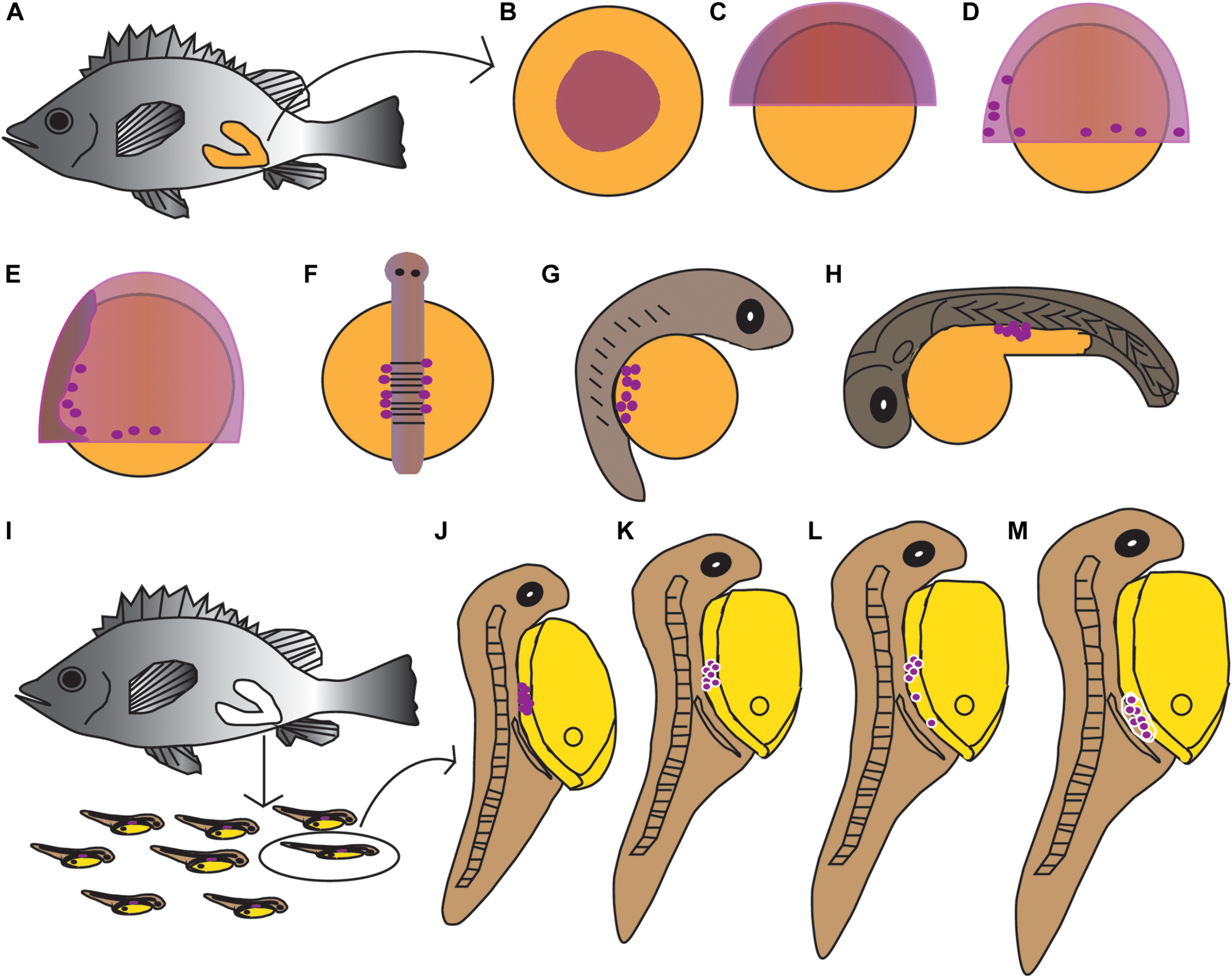 Figure 4. Schematic illustration of the germline formation process in Sebastes schlegelii. Dark purple spots indicated PGCs signals. (A–H) The migration of PGCs from embryos in female fish after fertilization. (A) The overall appearance of the female after fertilization; (B) blastula stage; (C) 30% epiboly stage; (D) 70% epiboly stage; (E) 90% epiboly stage–early neurula stage; (F) somite stage; (G) heart beating stage; (H) hatching stage. (I–M) The migration of PGCs from larvae after birth. (I) The larvae were born from mature females; (J) 2 dab; (K) 8 dab; (L) 9 dab; and (M) 10–15 dab.