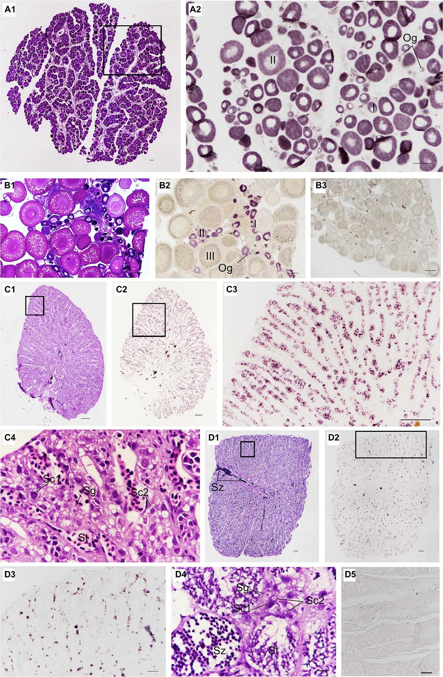 Figure 5. Distribution of Ssvas transcripts in gonad germ cells by SISH. Paraffin section and H&E of ovaries in 1-year-old (A1) and sexually mature black rockfish (B1), respectively. (A2) Adjacent tissue section of the black box in (A1) was hybridized with the Ssvas antisense probe. (B2) Adjacent tissue section of (B1) was hybridized with the Ssvas antisense probe. (B3) The paraffin section of the ovary was hybridized with the Ssvas sense probe. The paraffin section and H&E of testis in 1-year-old (C1) and sexually mature black rockfish (D1), respectively. (C2,D2) Adjacent tissue sections of (C1,D1) were hybridized with the Ssvas antisense probe, respectively. (C3,D3) The high-magnification image of the black boxes in (C2,D2), respectively. (C4–D4) The high-magnification image of the black boxes in (C1,D1), respectively. (D5) The paraffin section of testis was hybridized with the Ssvas sense probe. Og, oogonia; I, early previtellogenic phase; II, late previtellogenic phase; III, early vitellogenic phase; Sg, spermatogonia; Sc1, primary spermatocytes; Sc2, secondary spermatocytes; St, spermatids; Sz, spermatozoon. Scale bar, 100 μm (A1–C4,D3–D5); 200 μm (D1,D2).
