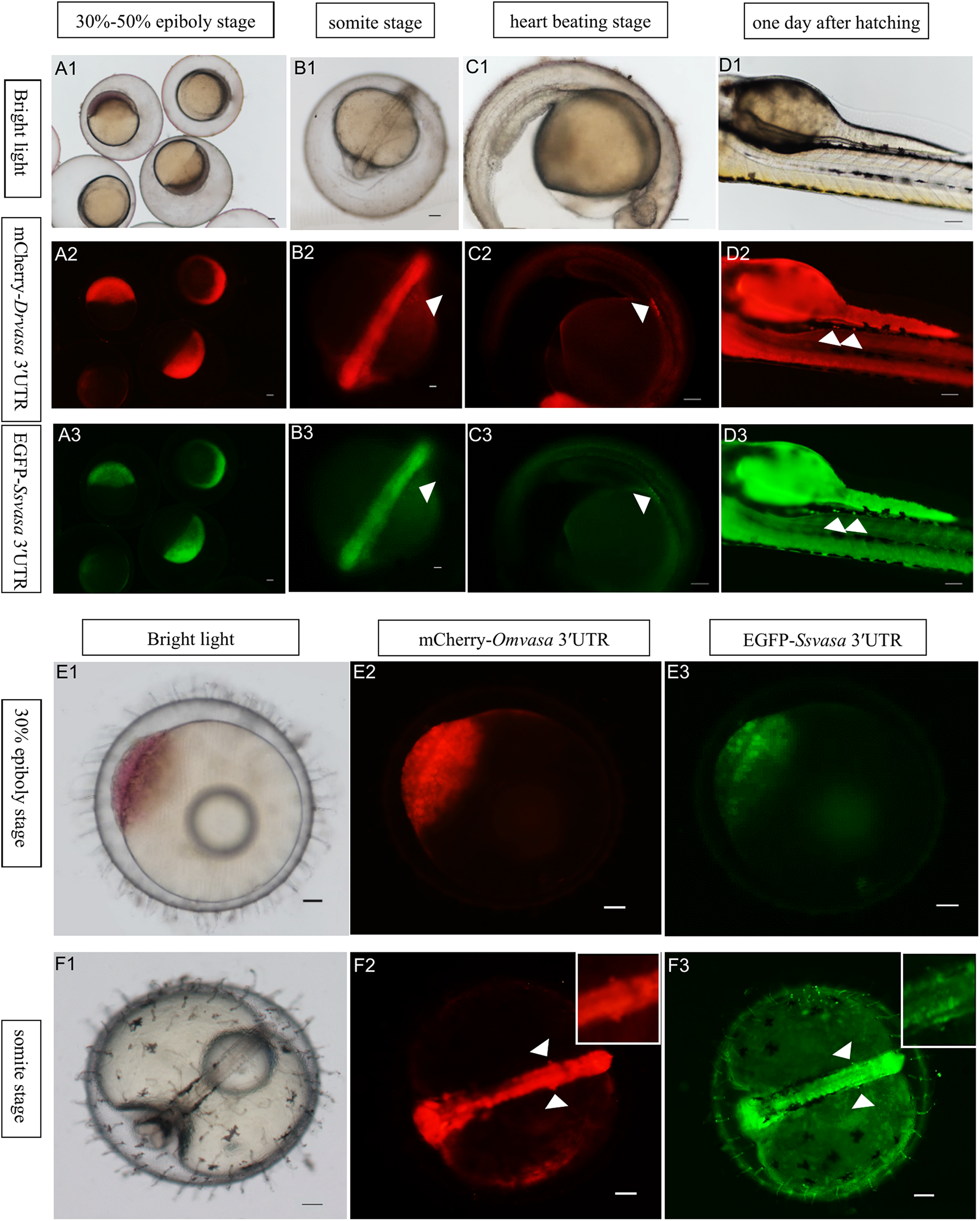 Figure 6. Visualization of the PGCs of zebrafish and marine medaka by Sebastes schlegelii vasa 3′UTR. (A1–D3) Visualization of zebrafish PGCs by co-microinjection EGFP-Ssvas 3′UTR and mCherry-Drvasa 3′UTR mRNAs. Fluorescence first expressed in the blastoderm at the 30–50% epiboly stage (A1–A3); PGCs differentiated from somatic cells and gathered on both sides of the embryonic body at the somite stage (B1–B3); PGCs aggregated under the trunk at the heart beating stage (C1–C3) and settled on the dorsal part of the gut at 1 day after hatching (D1–D3). (E1–F3) Visualization marine medaka PGCs by co-microinjection of EGFP-Ssvas 3′UTR and mCherry-Omvasa 3′UTR mRNAs. Fluorescence appeared at the 30% epiboly stage (E1–E3) and PGCs aligned on both sides of the trunk at the somite stage (F1–F3). The insets in F2 and F3 were magnification of signal areas. PGCs were indicated by white arrows. Scale bars, 100 μm.