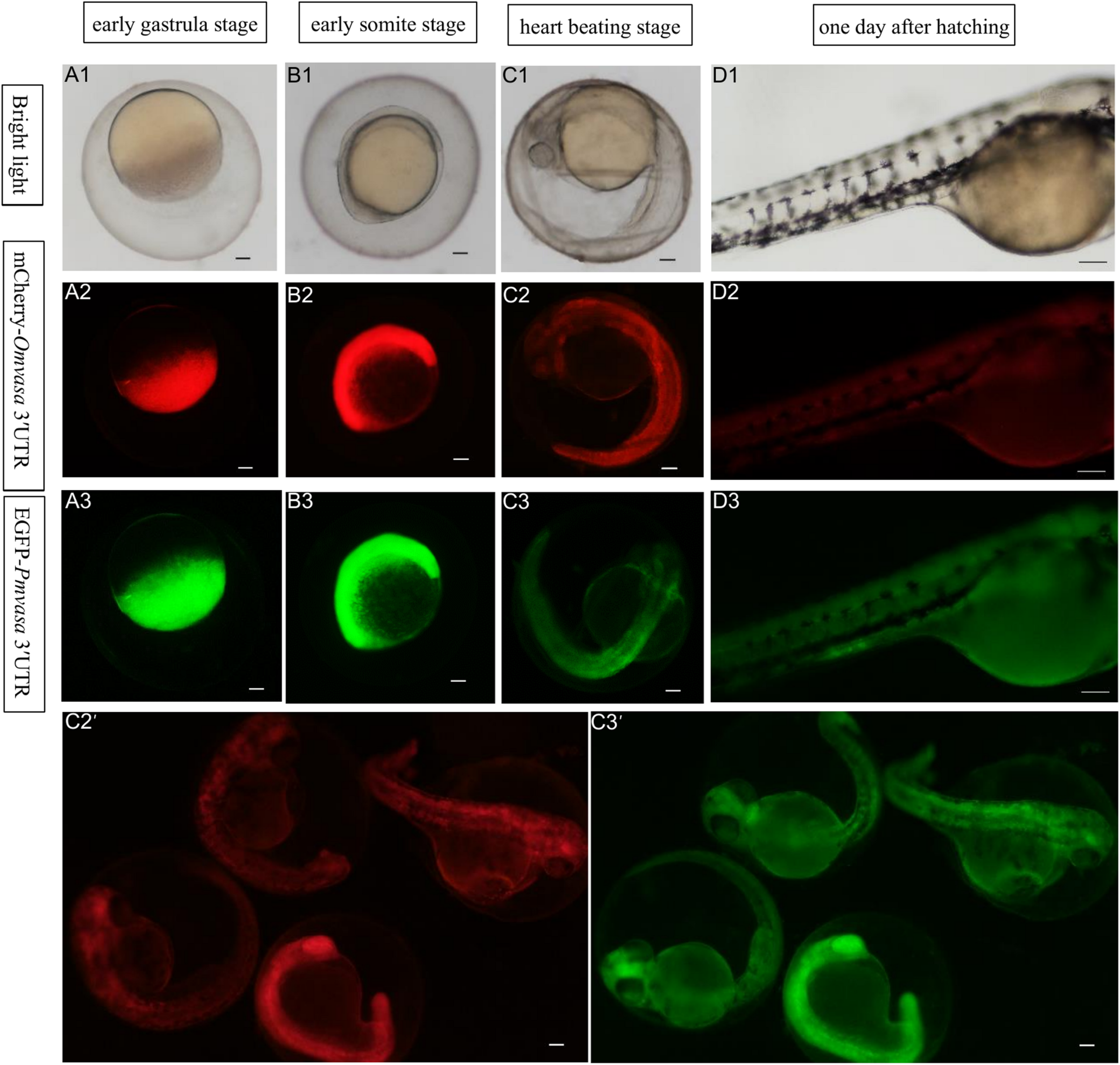 Figure 7. The ability of Oryzias melastigma and Pagrus major vasa 3′UTRs in labeling zebrafish PGCs. The EGFP-Pmvasa 3′UTR and mCherry-Omvasa 3′UTR mRNAs were co-microinjection into zebrafish embryos. Fluorescence appeared at the early gastrula stage (A1–A3) and highly expressed in the embryonic body at the early somite stage (B1–B3); PGCs did not differentiate from somatic cells at the heart beating stage (C1–C3) and 1 day after hatching (D1–D3). View of the embryos of the heart beating stage in a wide range (C2′,C3′). Scale bars, 100 μm.