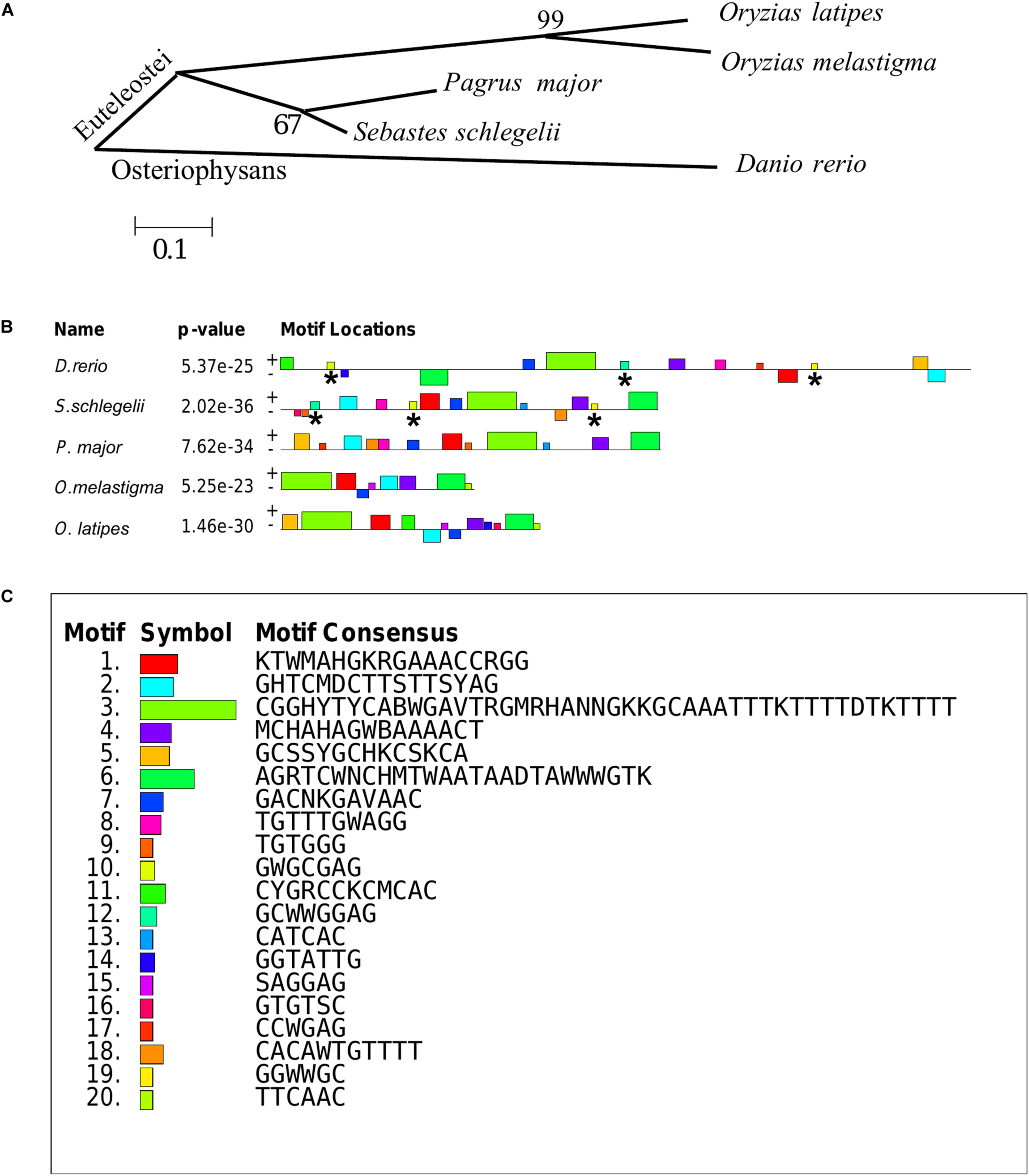Figure 8. Phylogenetic analysis and MEME motifs analysis in teleost vasa 3′UTRs. (A) Phylogenetic analysis of teleost vasa 3′UTRs by MEGA4. (B,C) Conservative functional motifs analysis in teleost vasa 3′UTRs by MEME. The twenty motifs designated as M1–M20 were indicated by different color codes (B), and every color code represented motif consensus (C). The motifs of M10, M12, and M19 marked with asterisks were only localized in Danio rerio and Sebastes schlegelii rather than the other three species.