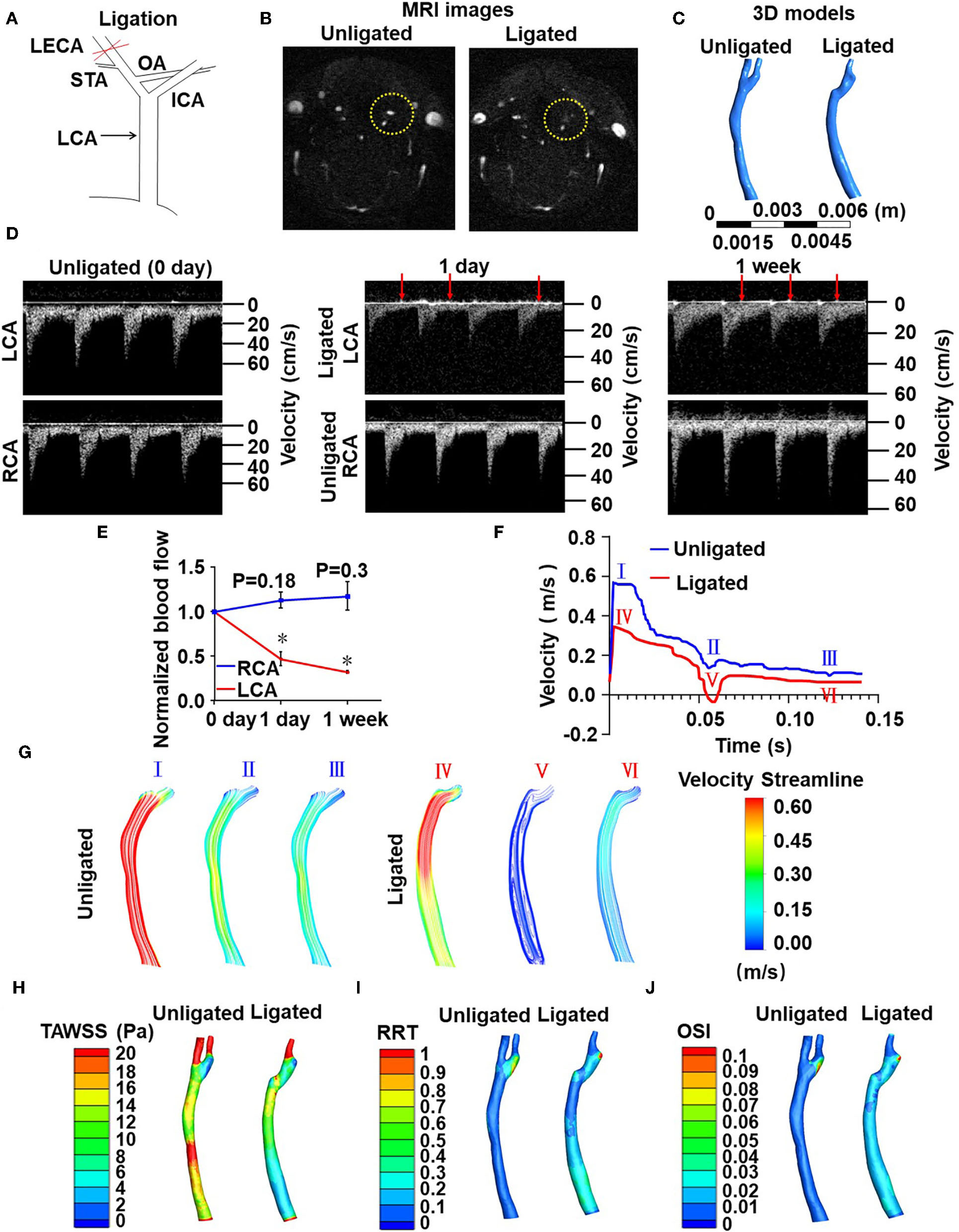 Ligation of LECA causes blood flow disturbance in the common carotid artery. (A) Ligation of LECA. LCA, left common carotid artery; ICA, internal carotid artery; STA, superior thyroid artery; OA, occipital artery. (B) Representative magnetic resonance imaging (MRI) of the neck of mice before (unligated) and after (ligated) ligation of LECA. Yellow circles indicate the LCA from unligated and ligated mouse. (C) 3D reconstruction of blood vessels in the neck from MRI images. (D) Blood flow velocity and directions of LCA and RCA were measured by high-resolution ultrasound doppler before ligation and 1 day or 1 week after ligation. Red arrows indicate reversals of blood flow. (E) Ligation of LECA reduces the blood flow of LCA, without significantly increasing RCA blood flow. (F) The velocity over a cardiac cycle in unligated and ligated mice. Peak systole (I and IV), end systole (II and V), distole (III and VI) in the pre- and post-ligation flow curves are indicated. (G) Images were color streamline of velocity magnitude in three time points of the pre- and post-ligation models. (H–J) Pseudocolor images of time-averaged wall shear stress (TAWSS) (H), Relative residence time (RRT) (I), and oscillation shear index (OSI) (J) in the common carotid arteries before and 1 week after ligation. The results represent the ratio of blood flow velocity after ligation to that before ligation. Data are mean ± SEM, n = 5, *P < 0.05.
