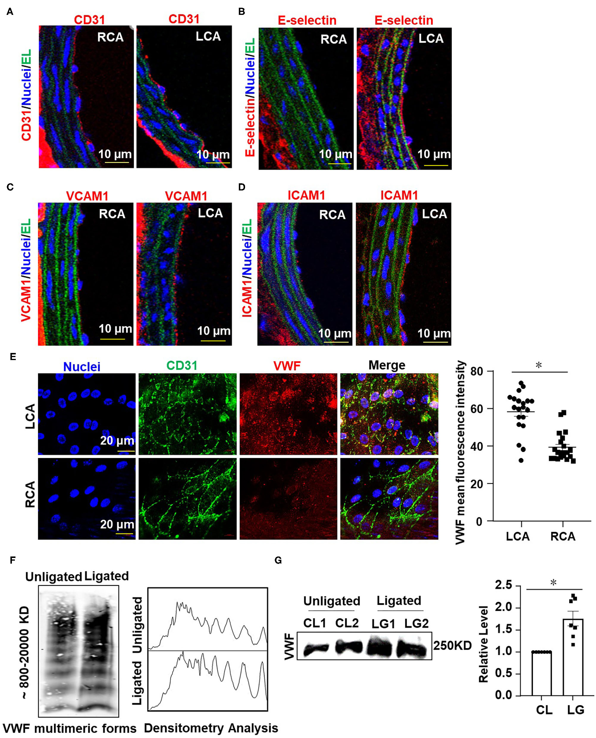 Ligation of LECA induces endothelial inflammation and VWF secretion. (A–D) Representative images for immunofluorescent staining of E-selectin (red), VCAM-1 (red), ICAM-1 (red), and endothelial marker CD31 (red) in the unligated RCA or the ligated LCA 1 week-post ligation. EL, elastic lamina (green), the number of tissue samples in (A–D) was 7 (n = 7). (E) VWF levels on the endothelial surfaces of the ligated LCA and the unligated RCA were assessed by en face immunofluorescence 1 day after external carotid artery ligation, and VWF mean fluorescence intensity in LCA and RCA were quantified. n = 20 (ligated LCA), n = 21 (unligated RCA). (F,G) The plasma level of VWF was determined at 1 day after ligation. VWF multimeric patterns and the total VWF level in plasma from the unligated or ligated mice were detected by Western blot assay followed with SDS-agarose gel electrophoresis (F) or SDS-polyacrylamide gel electrophoresis (G). CL represented plasma was obtained from unligated mouse; LG represented plasma was derived from the ligated mice. Densitometric analysis of VWF multimers was performed (F, right panel) and the average gray values of VWF were analyzed quantitatively (G, right panel). Data are mean ± SEM, n = 7, *P < 0.05.