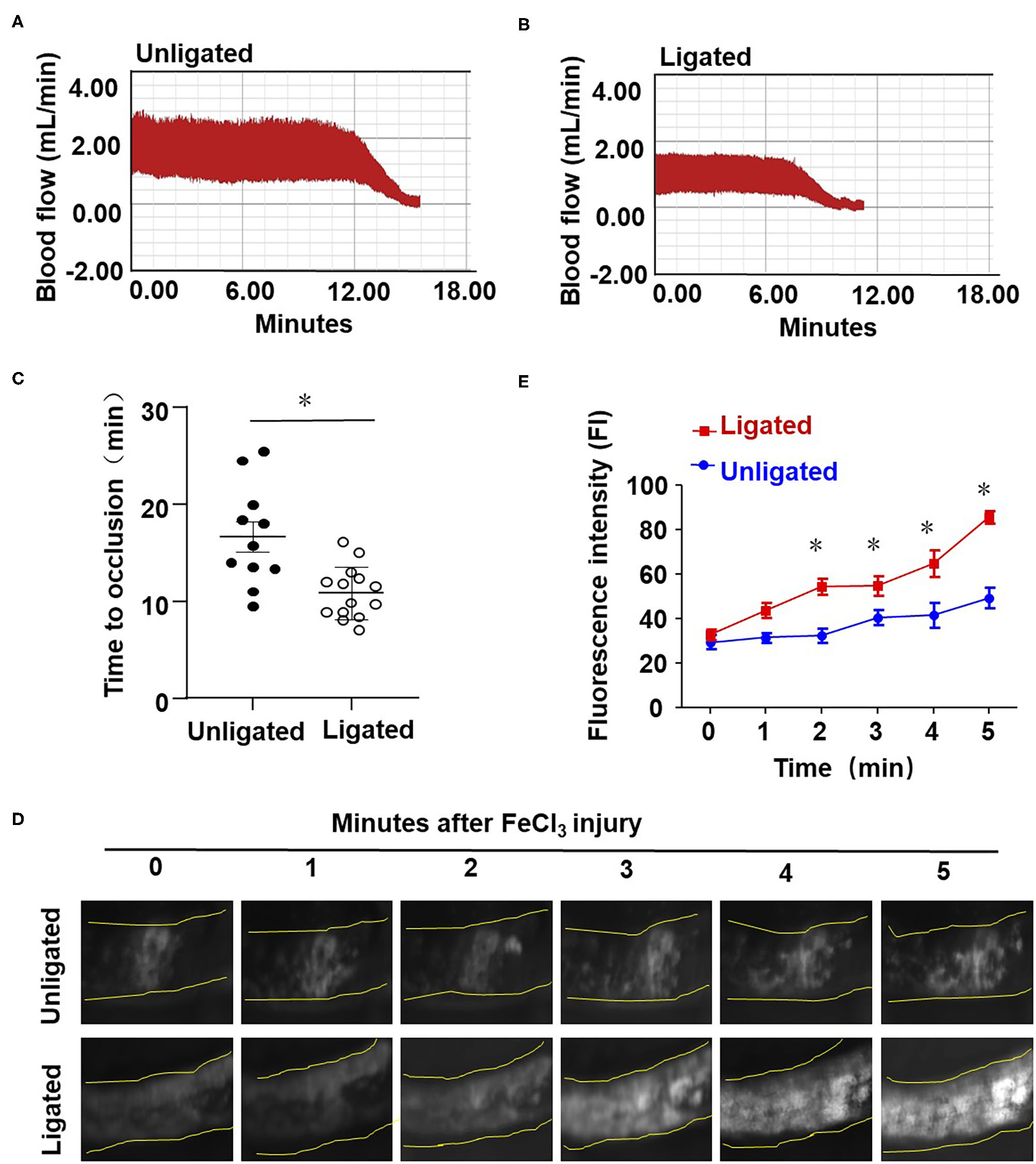 Ligation of LECA accelerates thrombosis upon FeCl3-induced arterial injury. (A,B) The LECA of C57BL/6 mice were ligated or unligated (sham operation), and blood flow in the LCA following 20% FeCl3 induced injury was monitored by a doppler echocardiogram. The FeCl3 injury-induced thrombosis assay was performed at 1 day after ligation. Representative image is the timeline starting immediately from placement of the 20% FeCl3 filter paper to the time to occlusion of the unligated (A) or ligated mice (B). (C) The time of thrombus formation in unligated and ligated mice was analyzed quantitatively, n = 11 (unligated mice), n = 14 (ligated mice). (D) Rhodamine 6G was injected into the right jugular vein of unligated and ligated mice to label platelets, and platelet adhesion to LCA was monitored immediately upon application of 20% FeCl3 (1 day after ligation). Images showed platelet adhesion and thrombus formation in carotid arteries within the indicated durations (3 min) after the application of 20% FeCl3. (E) Comparison of the fluorescence intensity in FeCl3-treated arteries from unligated and ligated mice, n = 5 (unligated mice), n = 5 (ligated mice). Data are mean ± SEM, *P < 0.05.