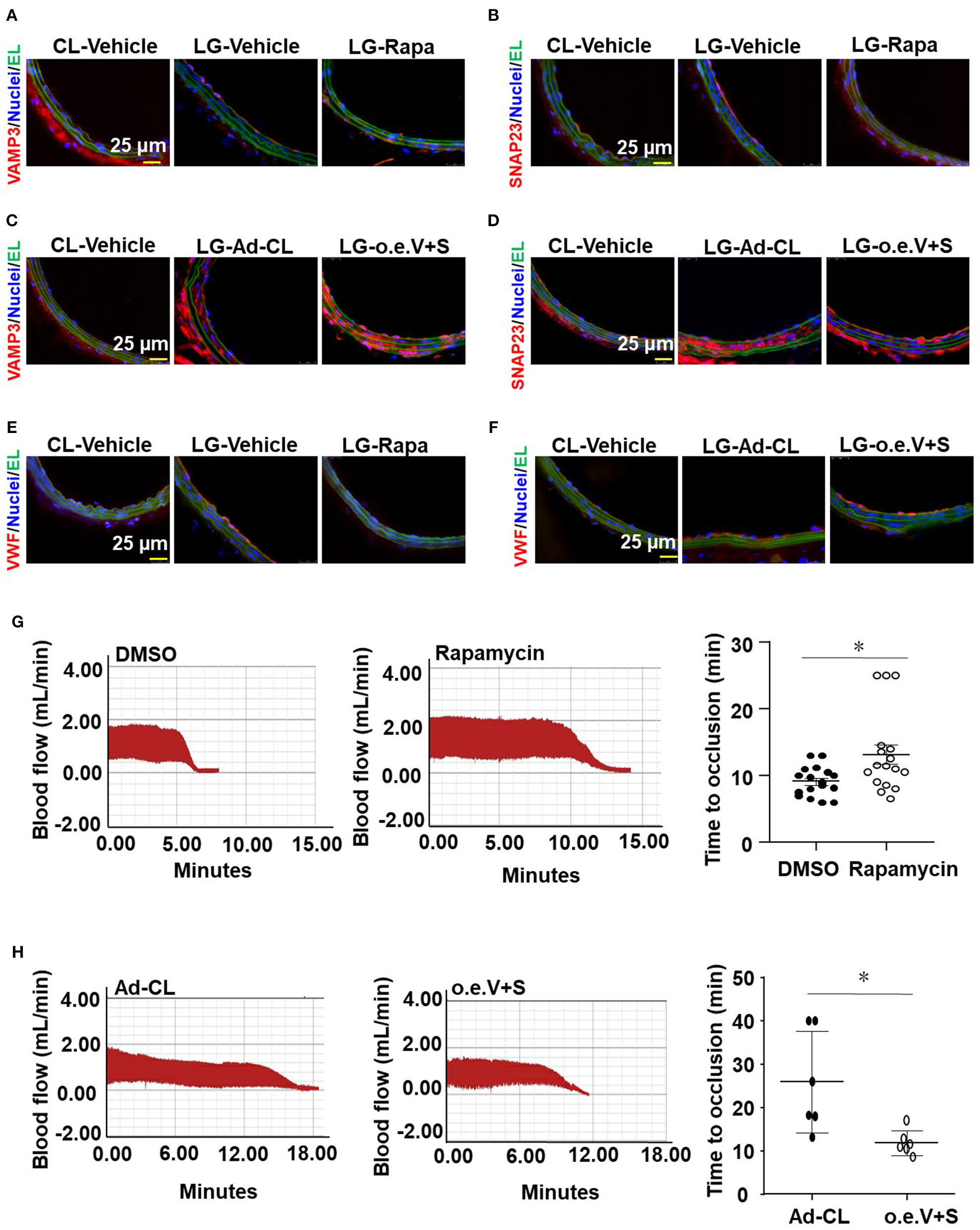 VAMP3 and SNAP23 play important roles in disturbed flow-induced thrombosis. C57BL/6 mice were subjected to ligation of LECA. Some mice were then subjected to intraperitoneal injection with rapamycin (Rapa, 1 mg/kg body weight) or the control vehicle (DMSO) every other day for 7 days (A,B), others were subjected to a locally intraluminal incubation with adenovirus expressing VAMP3(Ad-VAMP3) and SNAP23(Ad-SNAP23) or the control virus (Ad-CL) (C,D). (A–F) Representative images of immunofluorescent staining of VAMP3, SNAP23 and VWF in unligated RCA or ligated LCA of mice. CL, the unligated RCA; LG, the ligated LCA; EL, Elastic lamina; o.e.V+S, Ad-VAMP3 and Ad-SNAP23. (G,H) LCA of the ligated mice were then subjected to FeCl3-induced arterial injury. Blood flows in the LCA were monitored by a doppler echocardiogram. Representative images are the timeline starting immediately from placement of the FeCl3 filter paper to time to occlusion of the carotid artery occlusion. (G,H) Quantification and statistical analysis of the time to occlusion. Data are mean ± SEM, n = 17 per group (G), n = 6 per group (H), * P < 0.05.
