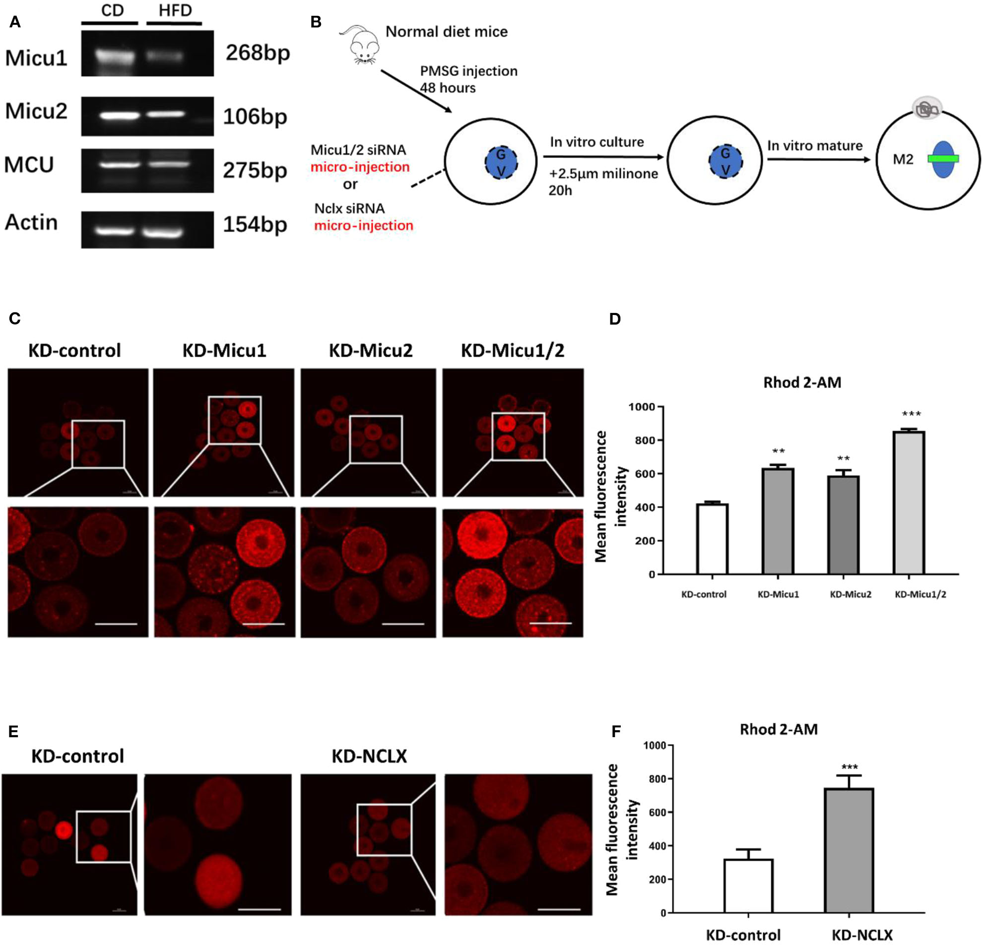 Previous research has shown that oocytes from obese mice exhibit higher mitochondrial Ca2+ levels, then real-time PCR to analyze the expression of gatekeeper of mitochondrial Ca2+ uniporter, Micu1 and Micu2 between control and obese mice. As shown in Figure 1A, the expression of Micu1 and Micu2 in obese oocytes significantly decrease. To generate the mitochondrial overload model in mouse oocytes, we separately targeted Micu1/Micu2 and NCLX for knockdown with siRNA injected into oocytes (Figure 1B, Supplementary Figures 1A–C). Then, we used Rhod-2 AM to analyze mitochondrial Ca2+ levels with a confocal laser scanning microscope. To confirm that Rhod-2 AM can be used to show the level of mitochondrial Ca2+ specially, we treated the GV oocytes with the mitochondrial reactive dye Mito-tracker (Green) co-stained with Rhod-2 AM. As shown in Supplementary Figure 2, double staining revealed co-localization of these two reactive dyes, declaring that Rhod-2 AM was reliable.