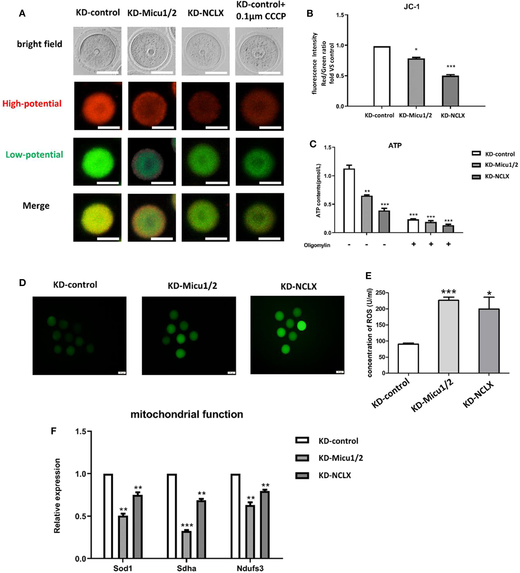 Maturation of the oocyte is a complex progress dependent on mitochondria (Wakai et al., 2012). Previous research has shown that mitochondrial Ca2+ homeostasis plays an important role in regulating energy metabolism and several complexes of the electron transport chain (Luongo et al., 2017). Mitochondrial membrane potential (MMP) is an indicator of mitochondrial function, so we used JC-1 to quantify MMP levels in mouse oocytes (Figures 2A,B). Additionally, mitochondria are important organelles that generate ATP in eukaryotes (Deguchi et al., 2015), if the function of mitochondrial is damaged, ATP level may be affected. To determine whether mitochondrial Ca2+ levels impair mitochondrial generated ATP, we used an ATP Assay Kit to quantify ATP levels. As expected, both KD-Micu1/2 and KD-NCLX decreased the MMP level and ATP level (Figures 2B,C), which indicated that mitochondrial Ca2+ overload leads to mitochondrial dysfunction in oocytes.