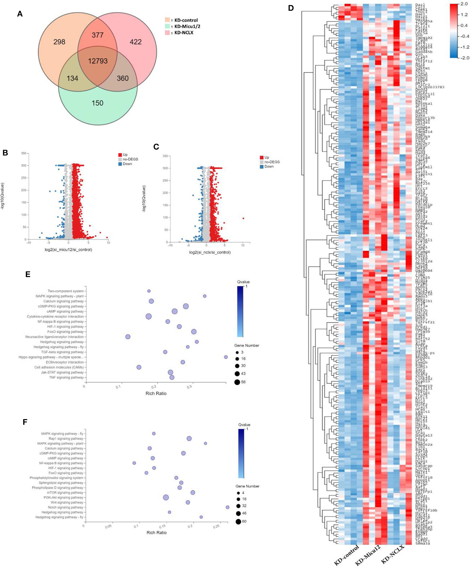 Gene expression changes upon KD-Micu1/2, KD-NCLX. (A) VENN showing differential genes in KD-Micu1/2 and KD-NCLX GV oocytes. (B) Volcano plot showing upregulated (red) and downregulated (blue) genes in KD-Micu12 GV oocytes. (C) Volcano plot showing upregulated (red) and downregulated (blue) genes in KD-NCLX GV oocytes. (D) Heatmap showing average expression for all replicates and relative expression between replicates for genes with cell cycle, division functions and mitochondrial functions (based on GO-term). (E) Go cellular component showing the biological process and function of the differential genes participated in KD-Micu1/2 GV oocytes (based on KEGG enrichment analysis). (F) Go cellular component showing the biological process and function of the differential genes participated in KD-Micu1/2 GV oocytes (based on KEGG enrichment analysis).