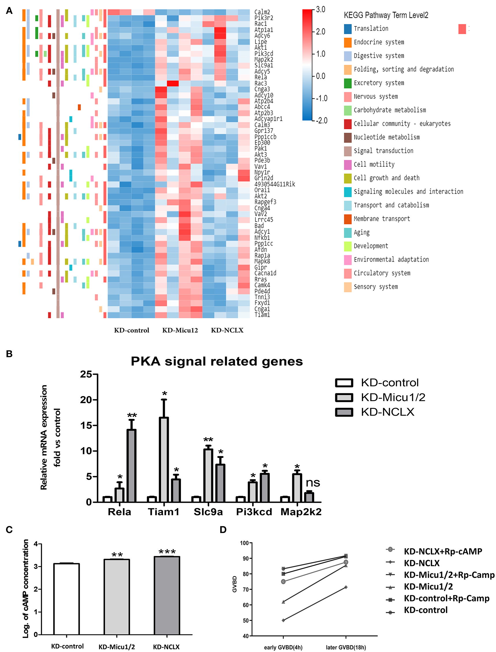 Mitochondrial Ca2+ overload leads to meiotic delays which may related to impairing PKA signaling. (A) Heatmap showing the average expression for all replicates and relative expression between replicates for genes with PKA signal pathway (based on GO term). (B) Dysregulation of genes associated with PKA pathway signaling in KD-control, KD-Micu1/2, and KD-NCLX oocytes (n = 30 for each group). (C) Quantification of the relative levels of cAMP in oocytes. (n = 40 for each group). (D) Percentage of GVBD at 2.5 h and 18 h after milrinone removal for oocytes treated with or without Rp-cAMP. (n = 24 for KD-control, n = 30 for KD-control+ Rp-cAMP, n = 24 for KD-Micu1/2, n = 24 for KD-Micu1/2+ Rp-cAMP, and n = 40 for KD-NCLX, n = 32 for KD-NCLX+ Rp-cAMP). Student's t-test and one-way ANOVA were utilized for statistical analyses. *P < 0.05, **P < 0.01, ***P < 0. 001; ns, non-significant (P > 0.05). Error bars indicate SEM.
