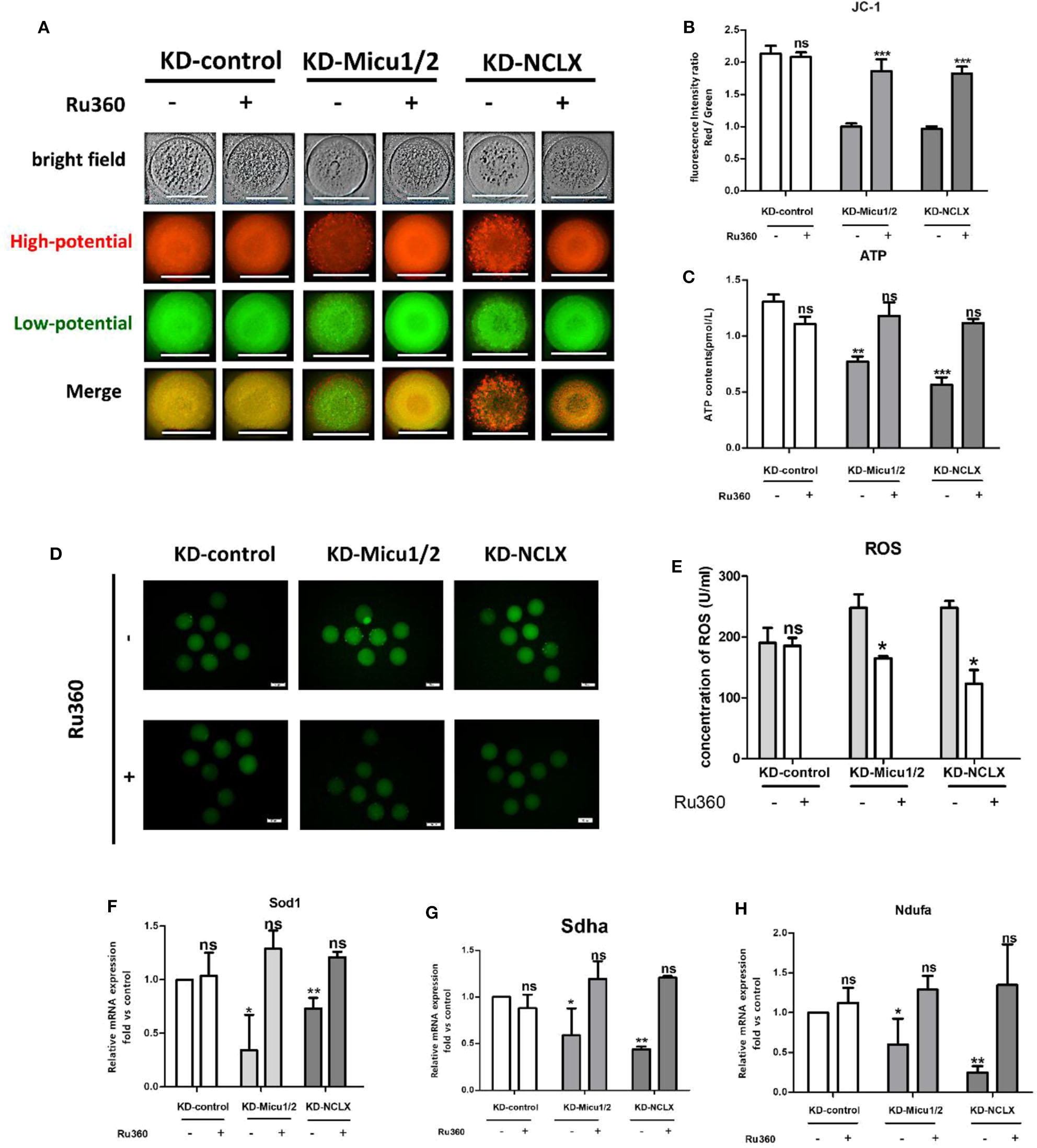 Mitochondrial dysfunction and recovery of oocyte maturation by decreasing mitochondrial Ca2+ levels. (A) Image of oocytes from KD-control, KD-control+Ru360, KD-Micu1/2, KD-Micu1/2+Ru360, KD-NCLX and KD-NCLX+Ru360 were stained with JC-1. (B) Oocytes from KD-control, KD-control+Ru360, KD-Micu1/2, KD-Micu1/2+Ru360, KD-NCLX, and KD-NCLX+Ru360 were stained with JC-1 and quantification of the Red/Green ratio of mitochondrial membrane potential (Δϕm) in oocytes (n = 30 for each group). (C) ATP (pM) concentrations were evaluated in individual oocytes from KD-control, KD-control+Ru360, KD-Micu1/2, KD-Micu1/2+Ru360, KD-NCLX, and KD-NCLX+Ru360 (n = 30 for each group). (D) Representative images of CM-H2DCFDA fluorescence (green) in germinal vesicle (GV) stage oocytes from KD-control, KD-control+Ru360, KD-Micu1/2, KD-Micu1/2+Ru360, KD-NCLX, and KD-NCLX+Ru360. Scale bar: 50 μm. (E) Quantification of the relative levels of ROS in oocytes. (n = 35 for each group). (F–H) Expression levels of genes involved in mitochondrial function (Ndufs3, Sdha, and Sod1) in GV-stage oocytes from KD-control, KD-control+Ru360, KD-Micu1/2, KD-Micu1/2+Ru360, KD-NCLX, and KD-NCLX+Ru360 (n = 30 for each group). Student's t-test and one-way ANOVA were utilized for statistical analyses. *P < 0.05, **P < 0.01, ***P < 0. 001; ns, non-significant (P > 0.05). Error bars indicate SEM.