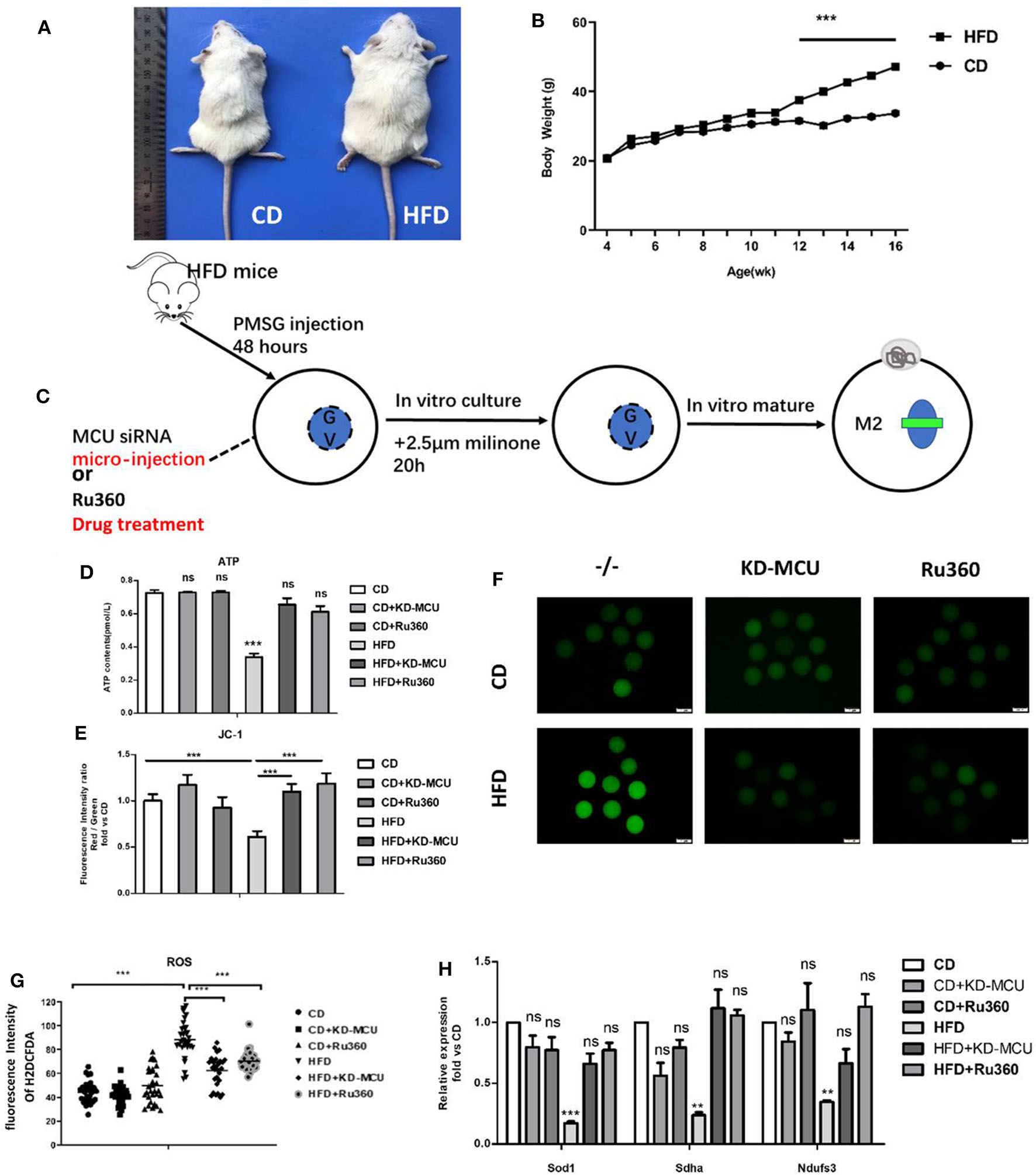 We have shown a meiosis maturation defect in GVBD from mitochondrial Ca2+ overload oocytes, which may be a consequence of mitochondrial dysfunction. Further, the capacity of impaired mitochondrial could be recovered by decreasing mitochondrial Ca2+ levels. Therefore, we examined whether the beneficial effects of decreasing mitochondrial Ca2+ levels could also ameliorate deficient mitochondrial function in oocytes of high fat diet (HFD) mice. Firstly, we established an obesity model by feeding HFD diet 12 weeks constantly (Figures 7A,B). And then GV-stage oocytes from control diet (CD) mice, HFD mice, and HFD mice infected with an siRNA targeting MCU (HFD + KD-MCU), and HFD mice administered Ru360 (HFD+Ru360) (Figure 7C). All of these groups were analyzed for ROS, ATP, and Δϕm levels as well as the mRNA expression level of mitochondrial function genes Ndufs3, Sdha, and Sod1. As shown in Figures 7D–H, the data suggested that downregulating mitochondrial Ca2+ levels promoted the potential of mitochondrial to improve quality of oocytes derived from obese mice. As mitochondrial function was closely associated with ATP content and oocyte quality, we further examined whether mitochondrial Ca2+ levels influence meiosis maturation. GV-stage oocytes from CD, HFD, HFD+ KD-MCU, and HFD+Ru360 mice were analyzed for frequency of GVBD and PB1 extrusion. The rates of GVBD and PB1 extrusion significantly increased after mitochondrial Ca2+ decrease, which suggested recovery of obese oocyte quality (Figures 7A–D). These observations indicated that proper downregulation of mitochondrial Ca2+ concentration could attenuate meiotic defects in damaged oocytes from obese mice.