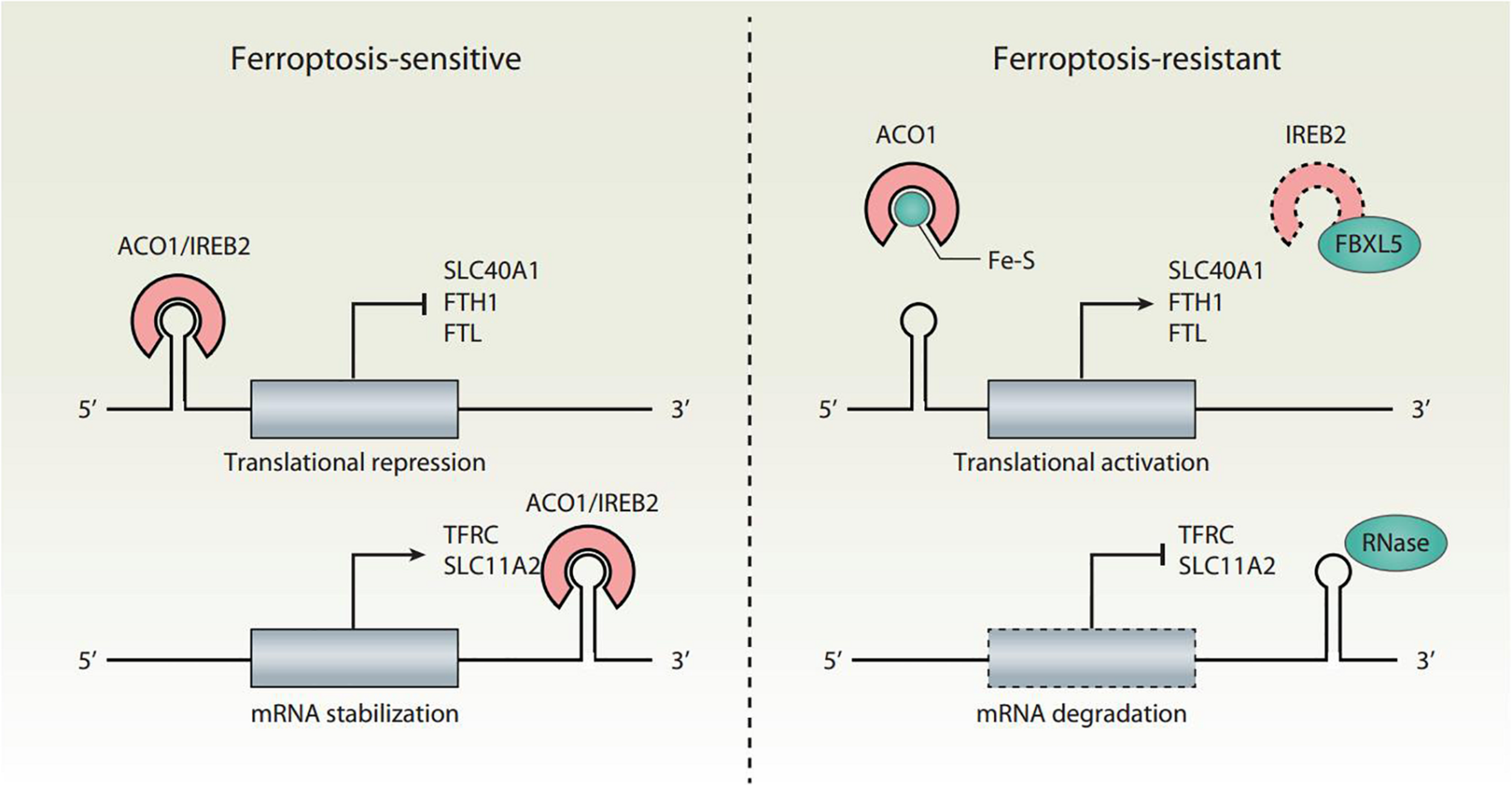 Translational regulation of iron homeostasis in ferroptosis. Ferroptosis is tightly regulated by IRPs (ACO1 and IREB2) at the translational level. The binding of IRPs to IREs leads to increased ferroptosis sensitivity through the translation suppression of SLC40A1, FTH1, and FTL, as well as the translation activation of TFRC and SLC11A2. The conversion of ACO1 into cytosolic aconitase blocks its binding to IREs. IREB2 is negatively regulated by FBXL5-mediated proteasomal degradation. Inhibition of the translation activity of ACO1 or the degradation of IREB2 induces a decrease in iron levels and renders cells resistant to ferroptotic cell death.