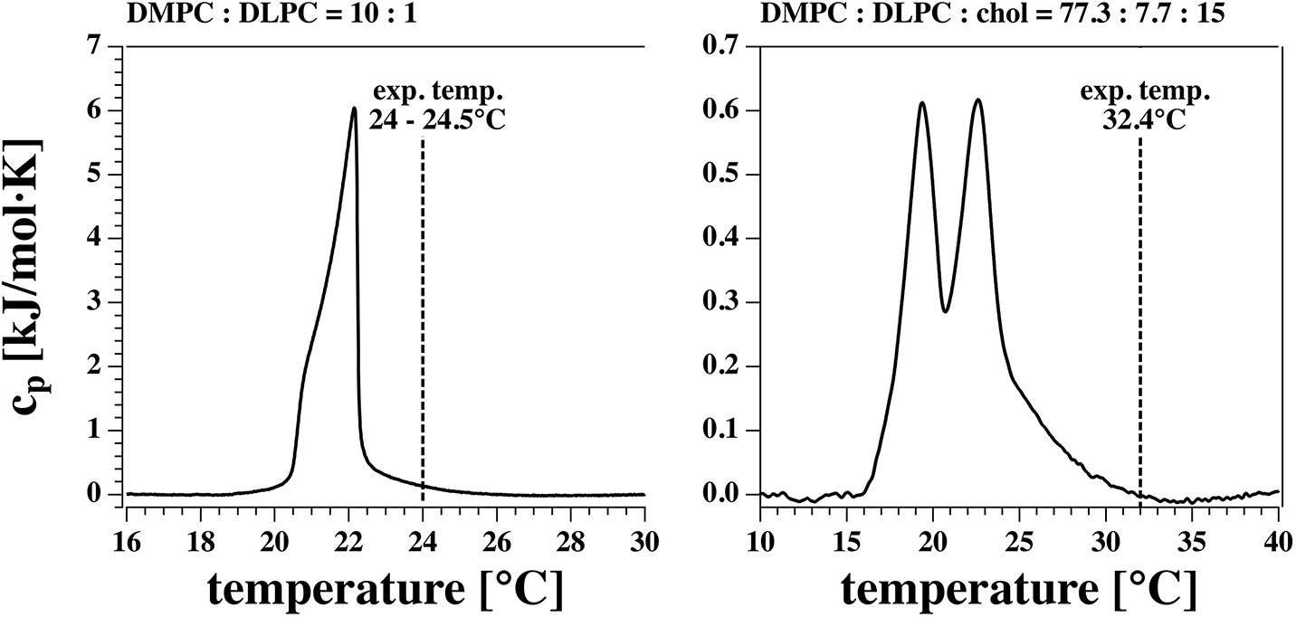 Calorimetric profiles of the two lipid mixtures used. The vertical dashed line indicates the experimental temperature at which I-V profiles and currents were measured.