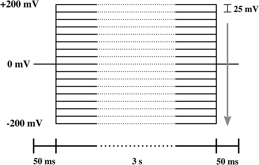 Protocol of the voltage steps used in the I-V measurement. The lower bar indicates the duration of each part of the protocol. The arrow shows the direction of voltage steps, which ranged from 200 to −200 mV in steps of −25 mV.