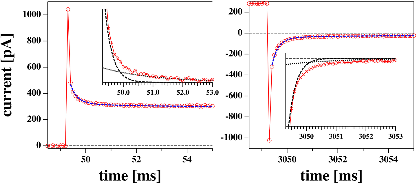 After a voltage jump, all the current traces measured showed an initial transient decay of about 10 ms from a current peak at t = 50 ms (the time of the voltage step, see Figure 4) to their steady state value (the current value at t = 3 s). The transient part of the current contains information about the charging of the pipette (and electrodes), the charging of the membrane and any relaxation phenomena in the membrane which can lead to changes in resistance, capacitance, and polarization.