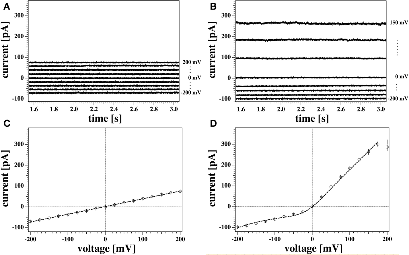 In order to obtain steady state currents for the I-V profiles, we restricted ourselves to determine averages of the second half of the current traces corresponding to the last 1.5 s after each voltage step (open circles in Figures 5C,D).