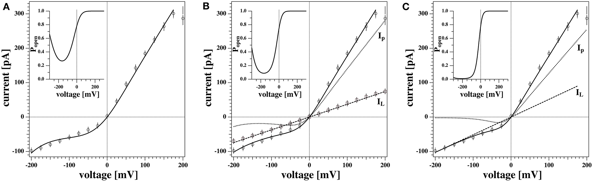 Three different scenarios to fit the non-linear current-voltage relations. (A) Conductions by pores only (gL = 0). (B) Conduction by voltage-dependent pores and a voltage-independent fixed leak current taken from the experiment in Figure 5C. (C) Same as (B) but the leak current was not fixed. The latter fit describes the data best. The inserts show the pore open probability for the three different scenarios. The minimum of Popen represents the offset voltage −V0. See text for details.