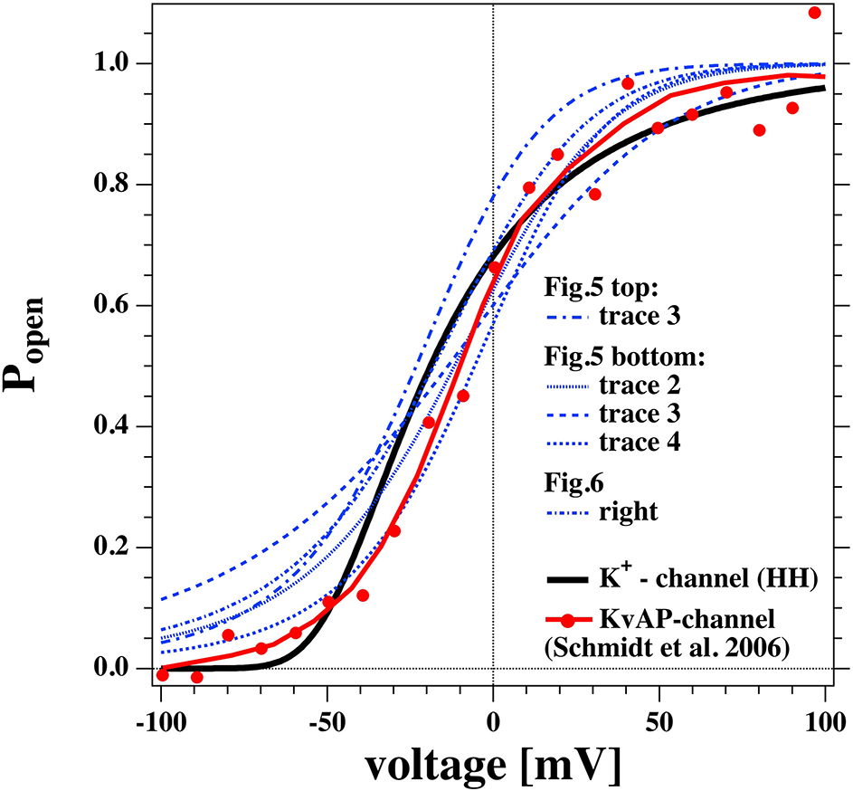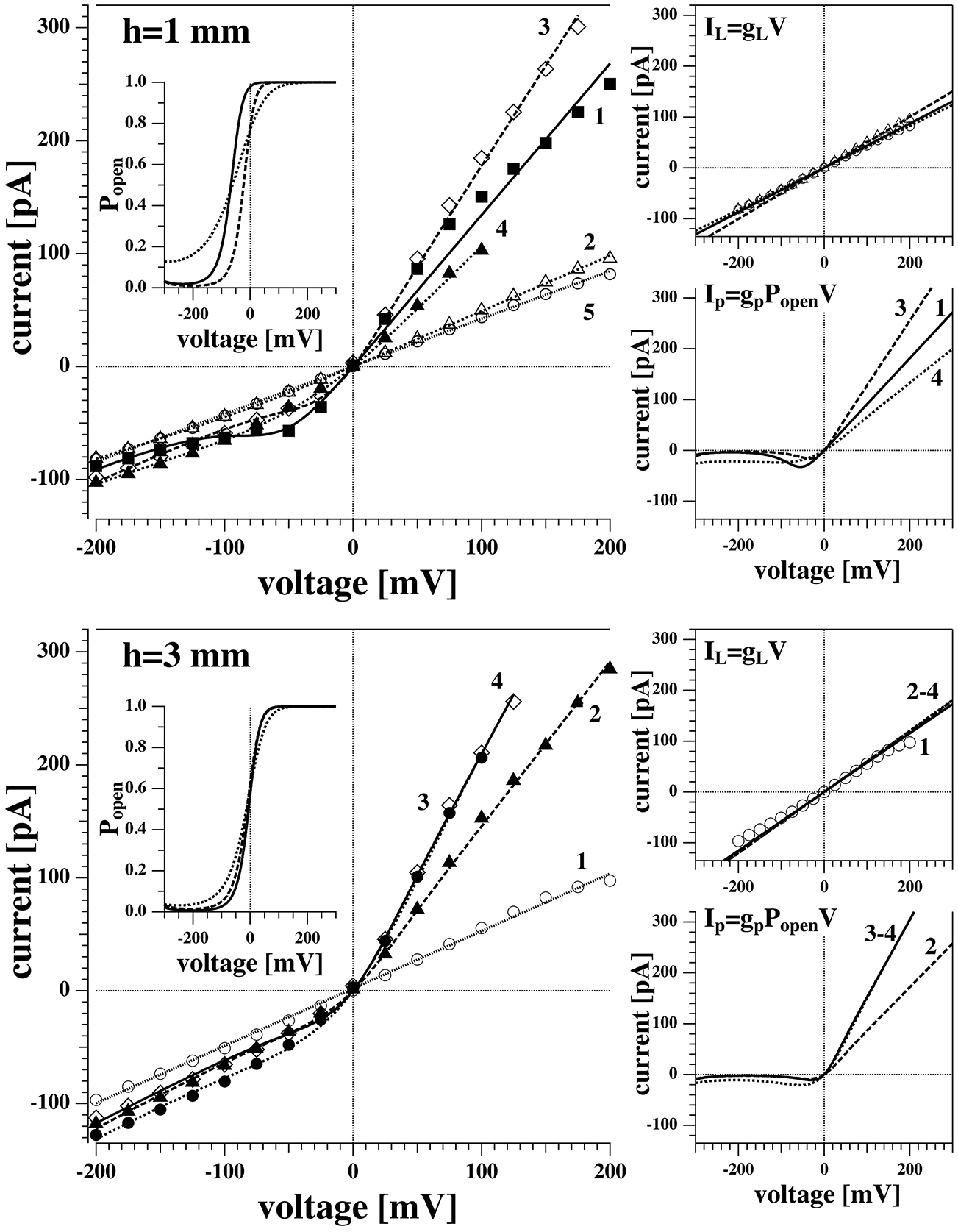 Therefore, we tentatively assumed that the two cases are only distinguished by the presence or absence of pre-pores that are ready to open but that the leak conductance of the membrane is identical in all experiments. Figure 6B shows a fit where the leak conductance gL was obtained from the linear I-V profile shown in Figure 5C. Its value was kept constant for fitting the rectified profile. We see that this describes the I-V profile quite well.
