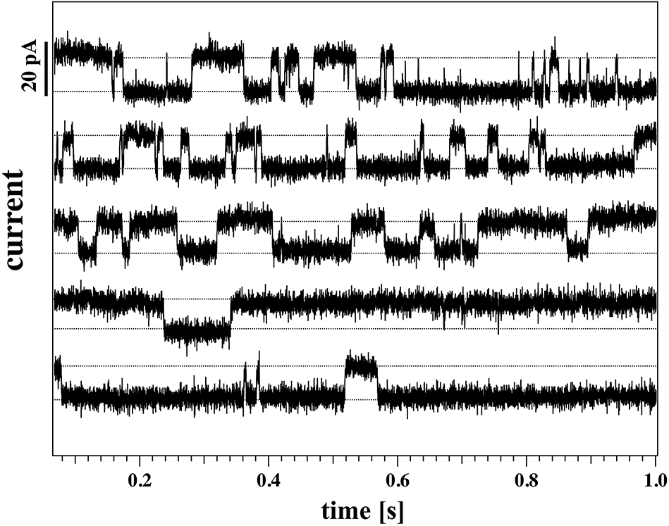 Both recordings in Figures 5A,B were obtained from the same membrane (membrane 1). Nevertheless, they show distinct features that are representative of all the recordings made on the two membranes used in the patch clamp measurements described in this work. These are outlined below.