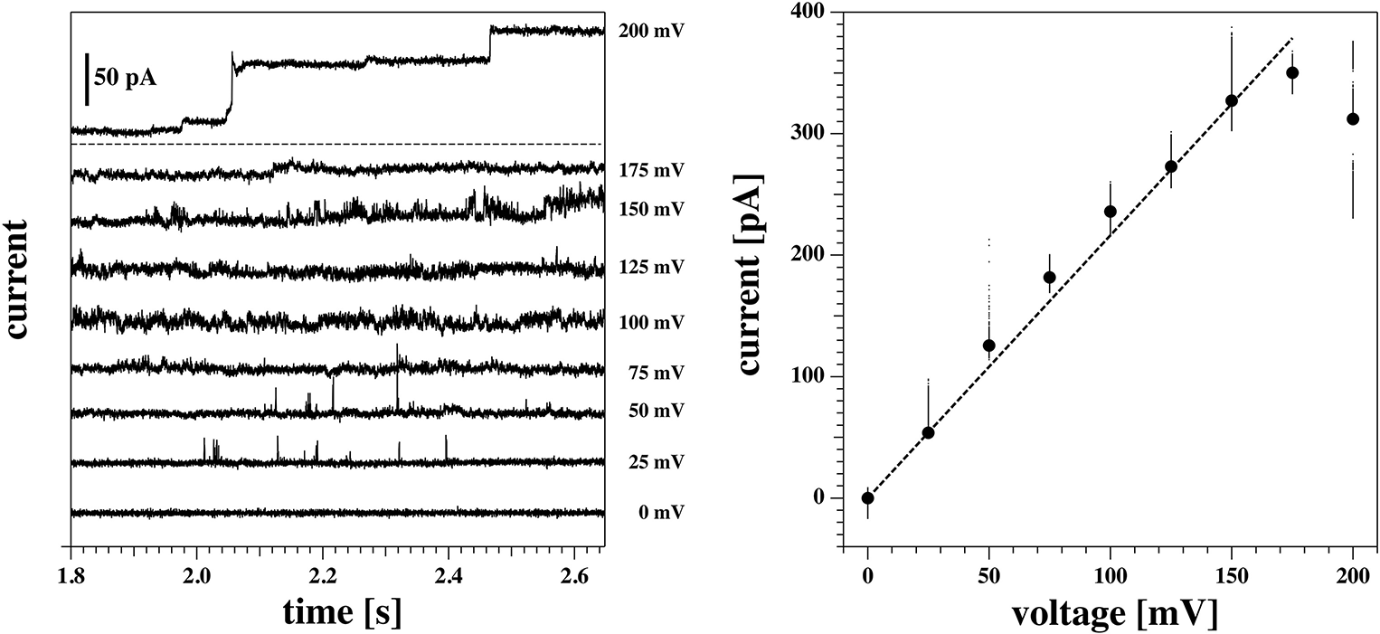 Current response of the same membrane as Figures 6, 7 (membrane 1) at a depth of 10 mm below the water surface. The membrane ruptured at 0 mV. Hence only the positive range is shown. (Left) Current traces at different voltages. The top trace is the response to the first jump of the protocol (from 0 to 200 mV), and it has been plotted separately for clarity. At this voltage, the membrane shows a step-wise increase in conductance, from an initial value of about 1.2 nS to a final one of roughly 1.8 nS. In the bottom panel, the other traces are shown. Current fluctuations start to appear in the form of spikes already at 50 mV, and increase in number and duration at higher voltages. (Right) Current-voltage relationship for the traces shown at the left. A linear fit gives a value of the conductance of 1.8 nS. This is in line with the final value of conductance for the trace at 200 mV. Due to its transient behavior, however, this trace has not been included in the fit.