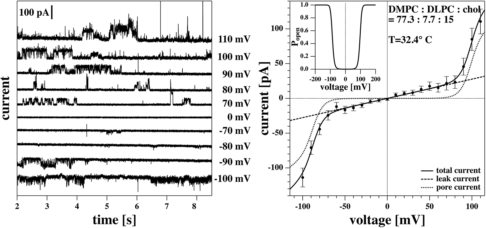 Recordings on a DMPC:DLPC:chol. = 77.3:7.7:15 BLM measured at 32.4°C. (Left) Current traces. For better visibility, they are evenly spaced on the vertical axis. Note, the current traces in the linear regime of the I-V profile are not shown. (Right) I-V-profile. The solid line is a fit of the I-V profile to Equation (5). The insert represents the pore open probability. Note that for the BLM, the I-V profile is symmetric and the channel activity occurs at both higher positive and higher negative voltages.