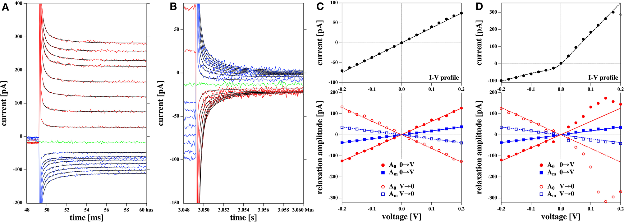 The current response of the membrane after a voltage jump was measured. As an example, we show two sets of recordings in Figures 5A,B. Possible voltage offsets were corrected by subtracting the mean value of the current at the holding voltage from the corresponding current trace during the step protocol.