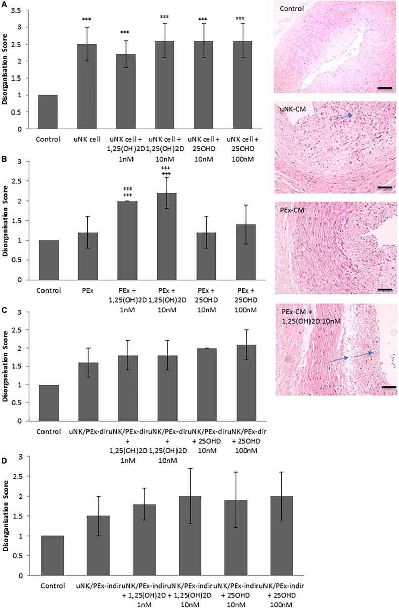 Effect of vitamin D on uNK cells and PEx ability to induce VSMC disorganization in a CPA model of spiral artery remodeling. (A) uNK cell CM induced VSMC disorganization, but vitamin D had no further effect. (B) PEx CM had no effect on VSMC disorganization, but treatment with vitamin D induced the ability of PEx CM to alter VSMC organization. (C,D) uNK cell and PEx in co-culture, either direct or indirect co-culture had no effect on VSMC disorganization, which was also not altered by treatment with vitamin D. N = 5 each condition; ***P < 0.0001 vs. control; +++P < 0.0001 vs. PEx alone. Arrows denote examples of disorganization. Scale bars = 50 μm.