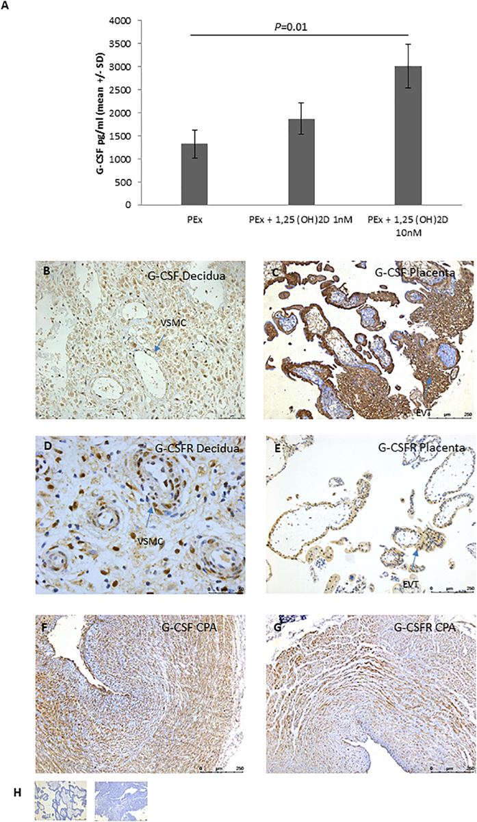 EVT expression of G-CSF. (A) Secretion of G-CSF by PEx after treatment with vitamin D; n = 5 each group. (B–E) Representative micrographs of immunohistological localization of G-CSF (B,C) and G-CSFR (D,E) in first trimester decidua basalis (B,D) and placenta (C,E). (F) Representative micrograph of immunohistological localization of G-CSF to CPA. (G) Representative micrograph of immunohistological localization of G-CSFR to CPA. (H) Representative negative control with mouse IgG (placenta) or rabbit IgG (decidua). EVT, extravillous trophoblast; VSMC, vascular smooth muscle cell.