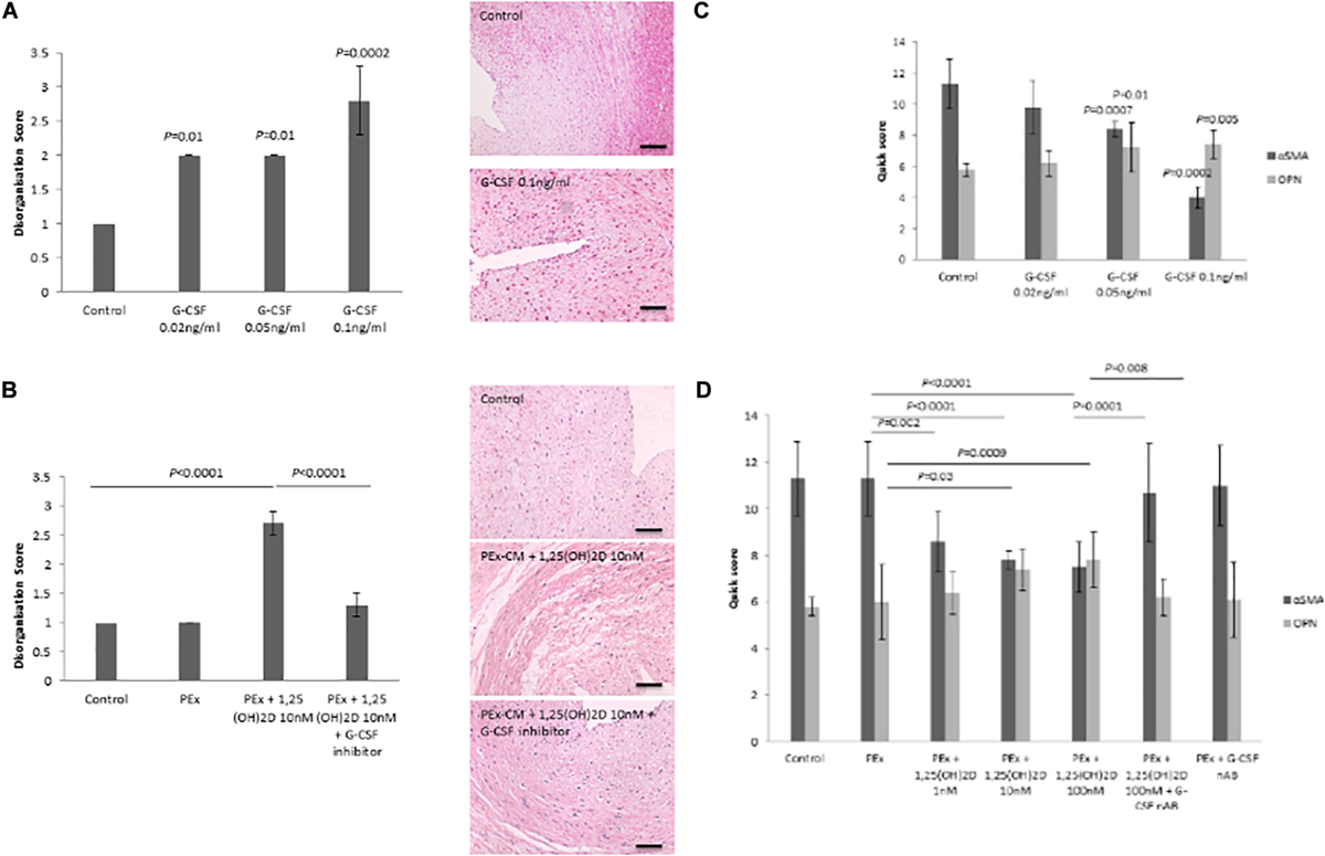 Another feature of SpA remodeling is phenotypic switching of the VSMCs from a contractile to a synthetic phenotype, as characterized by a decrease in αSMA and an increase in osteopontin expression (Robson et al., 2019). In the CPA model, G-CSF induced VSMC phenotypic switching (αSMA P = 0.0002; OPN P = 0.005; Figure 3C). 1,25(OH)2D treated PEx CM induced VSMC phenotypic switching (αSMA P < 0.0001; OPN P = 0.0009; Figure 3D), an effect that was abrogated following pre-treatment with G-CSF neutralizing antibody (αSMA P = 0.0001; OPN P = 0.008; Figure 3D).