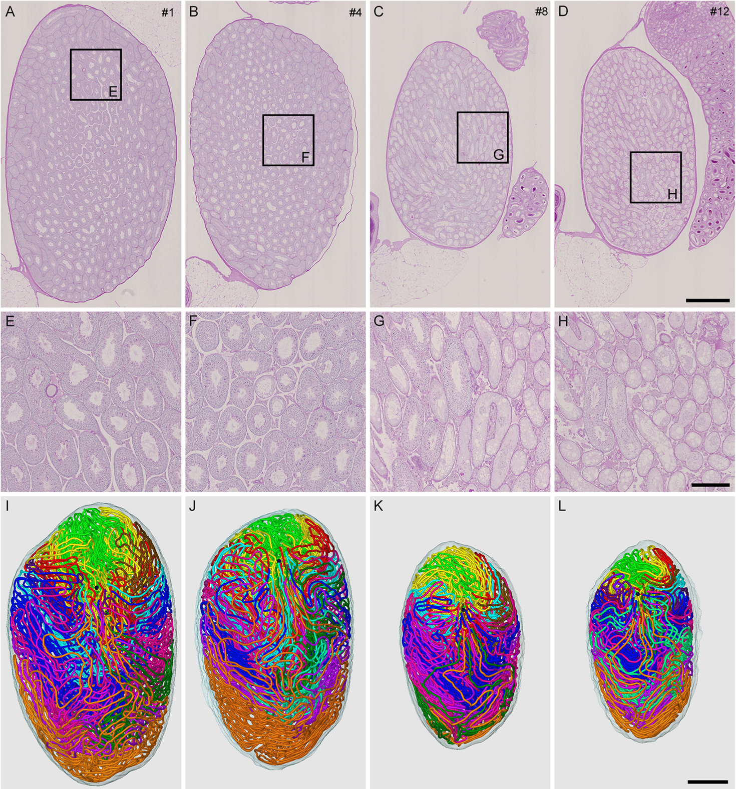 Reconstruction of all seminiferous tubules in mice treated with different busulfan doses (IP-0, 10, 20, and 30 for intraperitoneal injections of 0, 10, 20, and 30 mg/kg, respectively). PAS-H-stained longitudinal sections of testes from mouse #1 (A,E), 4 (B,F), 8 (C,G), and 12 (D,H), which represent IP-0, 10, 20, and 30, respectively, are shown at low (A–D) and high magnification (E–H, the framed areas in A–D). The 3D core lines of all reconstructed seminiferous tubules marked with different colors are shown (I–L for mouse #1, 4, 8, and 12, respectively) with the position of the rete testis (black sphere). Scales, 1 mm (A–D and I–L), 250 μm (E–H).