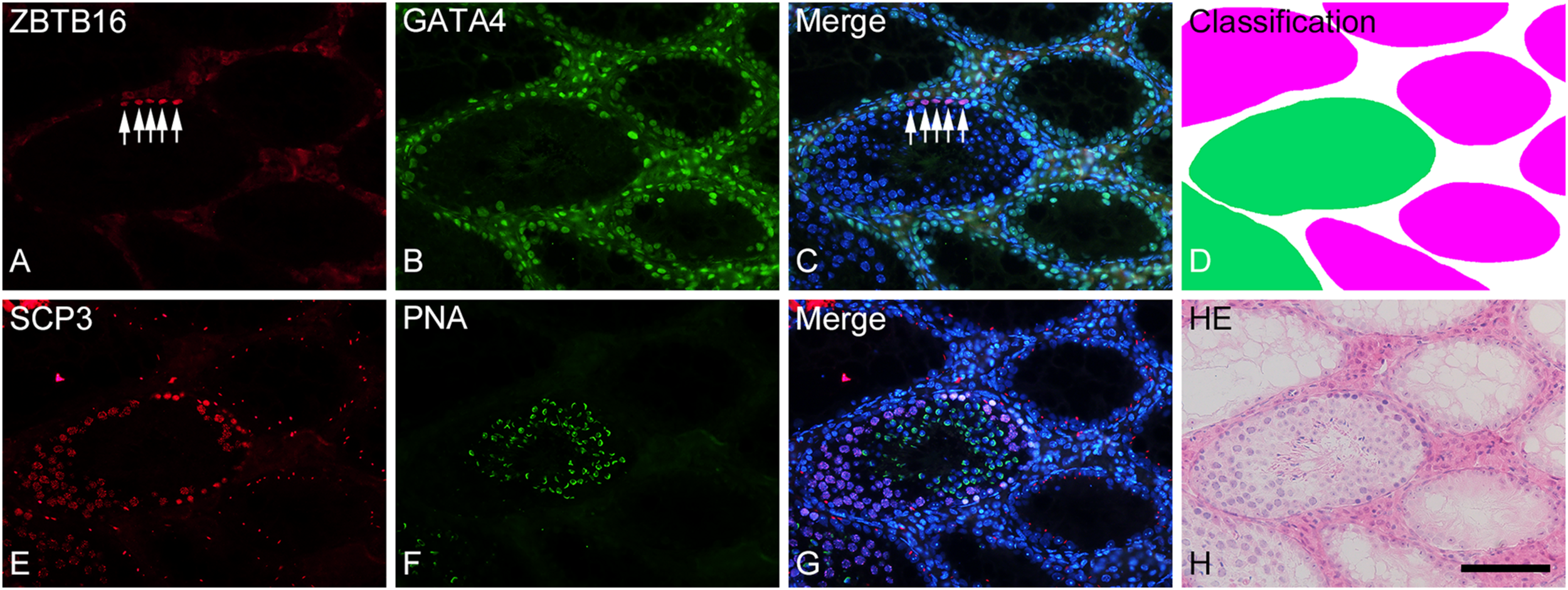 Photographs of a representative cross-section (A–D) and the adjacent cross-section (E–H) of a formalin-fixed IP-30 testis shown with double-fluorescence staining for ZBTB16 [(A); red] and GATA4 [(B); green] and for SCP3 [(E); red] and PNA-lectin [(F); green], respectively. (C,G) are merged pictures of (A,B) and (E,F), respectively, together with nuclear staining with DAPI (blue). (D) represents classification of tubule areas with normal (green) and markedly impaired (red) spermatogenesis in the same section as (A–C). (H) represents HE staining of the same section as (E–G). In the normal tubules, type A spermatogonia (arrows) are stained in nuclei for ZBTB16 (A), Sertoli cells are stained in nuclei for GATA4 (B), spermatocytes are stained in nuclei for SCP3 (E), and spermatids are stained in acrosomes for PNA (F). In contrast, in the markedly impaired tubules, only Sertoli cells but no other cell types are stained with the respective markers. Scale, 100 μm.