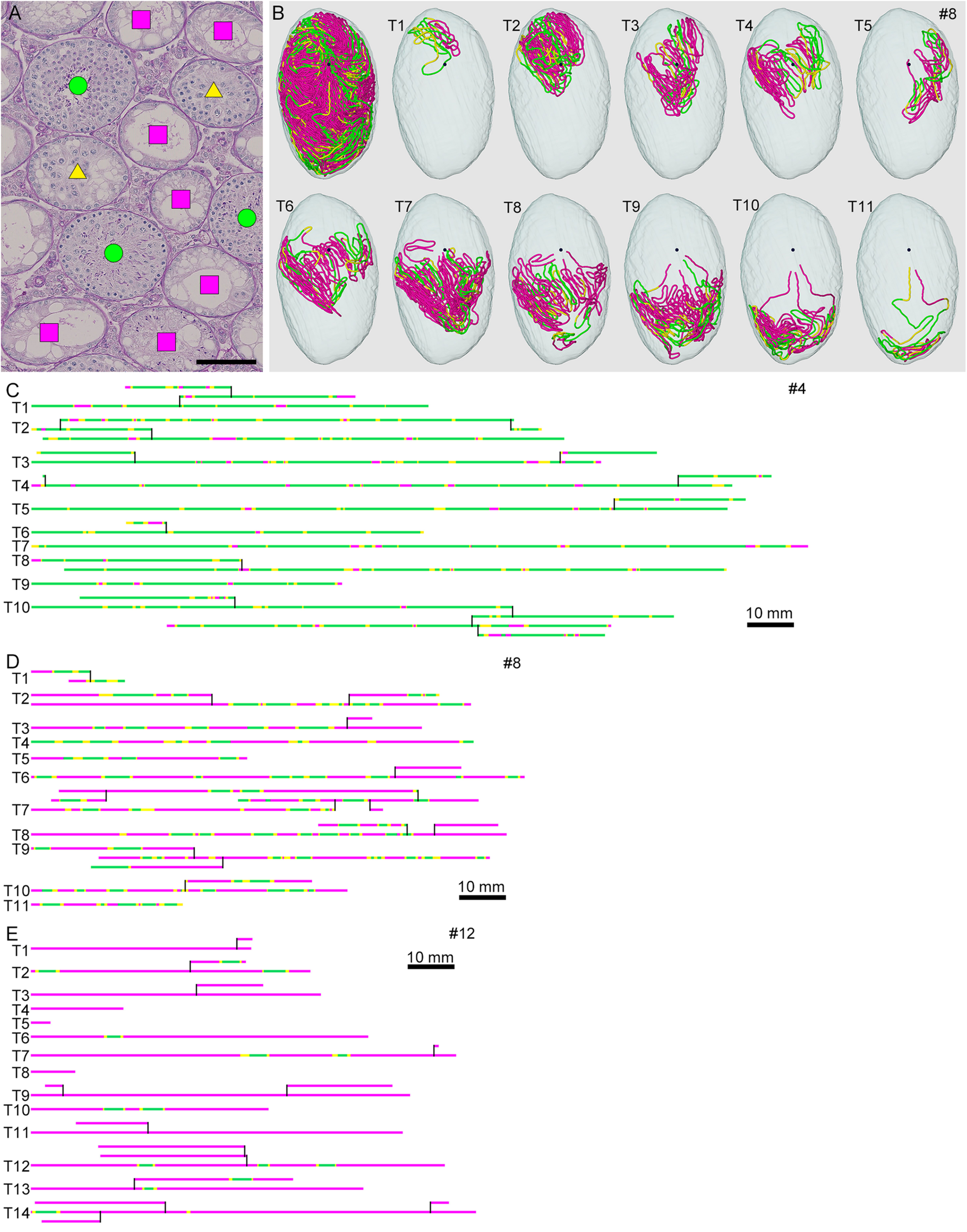 Classification of the degrees of spermatogenesis disorder in mice treated with different busulfan doses. All seminiferous tubules in each section are divided into three types: normal tubules (green circle), abnormal tubules with spermatocytes (yellow triangle), and abnormal tubules without spermatocytes (red square) [(A) for mouse #8]. The core lines of all reconstructed seminiferous tubules in #8, with areas belonging to the above three types marked with the corresponding colors, are shown in a vertical view with the position of the rete testis (black sphere) (B). The scheme of all individual seminiferous tubules in mouse #4 (IP-10), #8 (IP-20), and #12 (IP-30) is shown in (C–E). The segments composed of tubule areas belonging to the three types are marked with the corresponding colors. The branching points are shown with vertical bars. All free extremities of the tubules in these cases are connected to the rete testis in terminal points without forming blind ends. Scales, 100 μm (A), 10 mm (C–E).