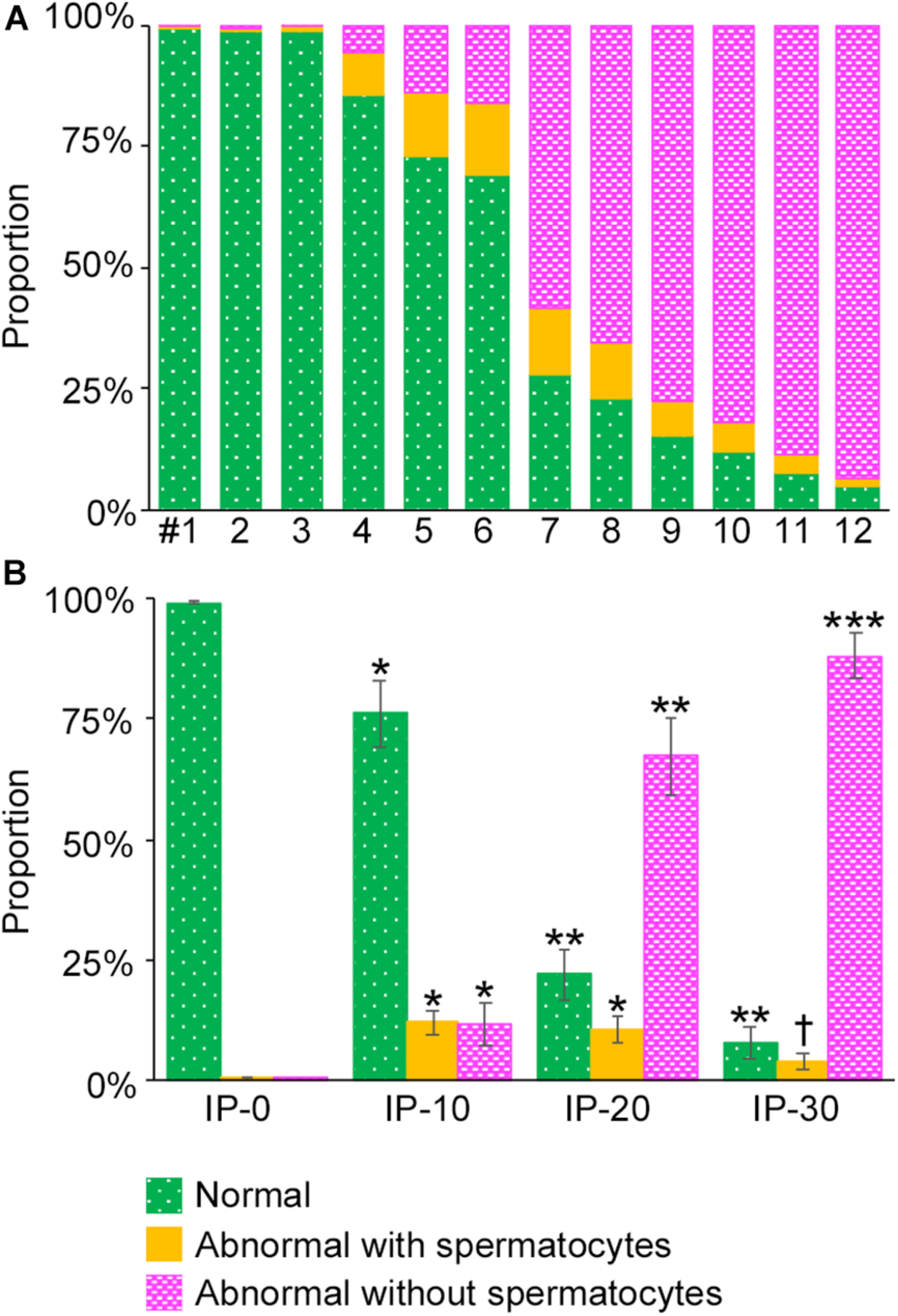 Proportions of different degrees of spermatogenesis disorder in the whole seminiferous tubules in mice treated with different busulfan doses. The proportions of tubule areas belonging to the three types marked with the corresponding colors are shown in individual mice (A) and in groups of mice (IP-0, 10, 20, and 30) (B). Each value represents the mean ± SD of three samples. Statistical analysis was performed in (B) between values for the same colors. *Significantly different from IP-0 (P < 0.05). **Significantly different from IP-0 and IP-10 (P < 0.05). ***Significantly different from IP-0, IP-10, and IP-20 (P < 0.05). †Significantly different from IP-10 and IP-20 (P < 0.05), but not from IP-0.