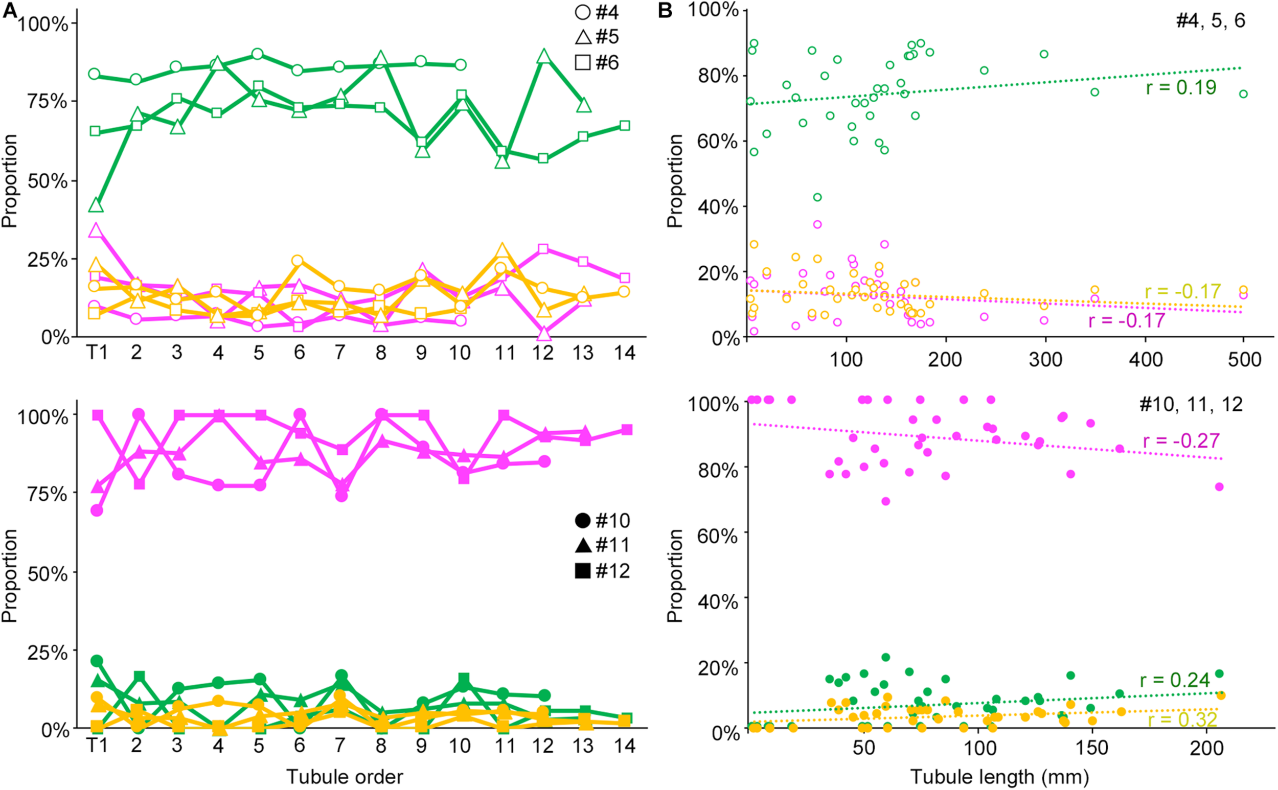 Relationships of the proportions of different degrees of spermatogenesis disorder with the order of all seminiferous tubules expressed as a line graph (A) and with the length of individual seminiferous tubules expressed as a scatterplot (B). The upper figures are for IP-10 (#4, 5, and 6) and the lower figures for IP-30 (#10, 11, and 12). The colors represent normal tubules (green), abnormal tubules with spermatocytes (yellow), and abnormal tubules without spermatocytes (red). In (A), the tubules are numbered from T1 to T10 (#4), to T12 (#10), to T13 (#5, 11), and to T14 (#6, 12) in the order of their connection with the rete testis from the top toward the bottom in the testis. The values are expressed with hollow circles, hollow triangles, and hollow squares for #4, 5, and 6, respectively, and with filled circles, filled triangles, and filled squares for #10, 11, and 12, respectively. In (B), the values are expressed as hollow circles for #4, 5, and 6, and with filled circles for #10, 11, and 12. The r values of the regression lines are indicated.