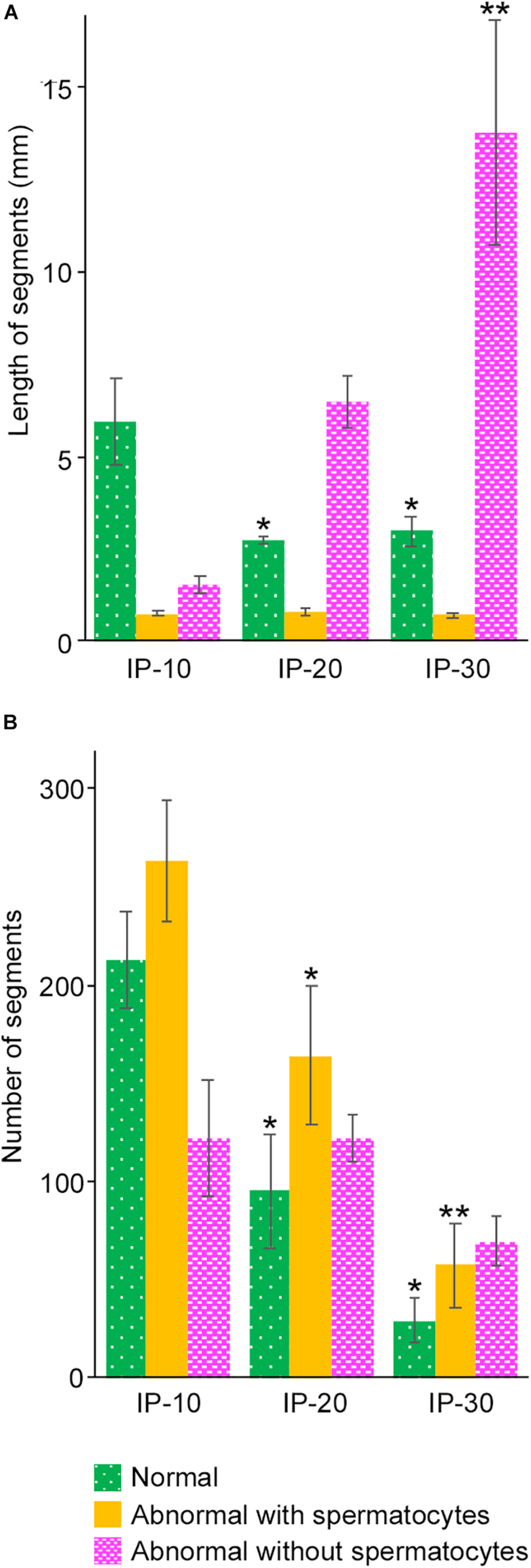 Mean lengths (A) and numbers (B) of the segments of seminiferous tubules with different degrees of spermatogenesis disorder in mice treated with different busulfan doses (IP-10, -20, and -30). The colors represent normal tubules (green), abnormal tubules with spermatocytes (yellow), and abnormal tubules without spermatocytes (red). Each value represents the mean ± SD of three samples. Statistical analysis was performed between values for the same colors. *Significantly different from IP-10 (P < 0.05). **Significantly different from IP-10 and IP-20 (P < 0.05).