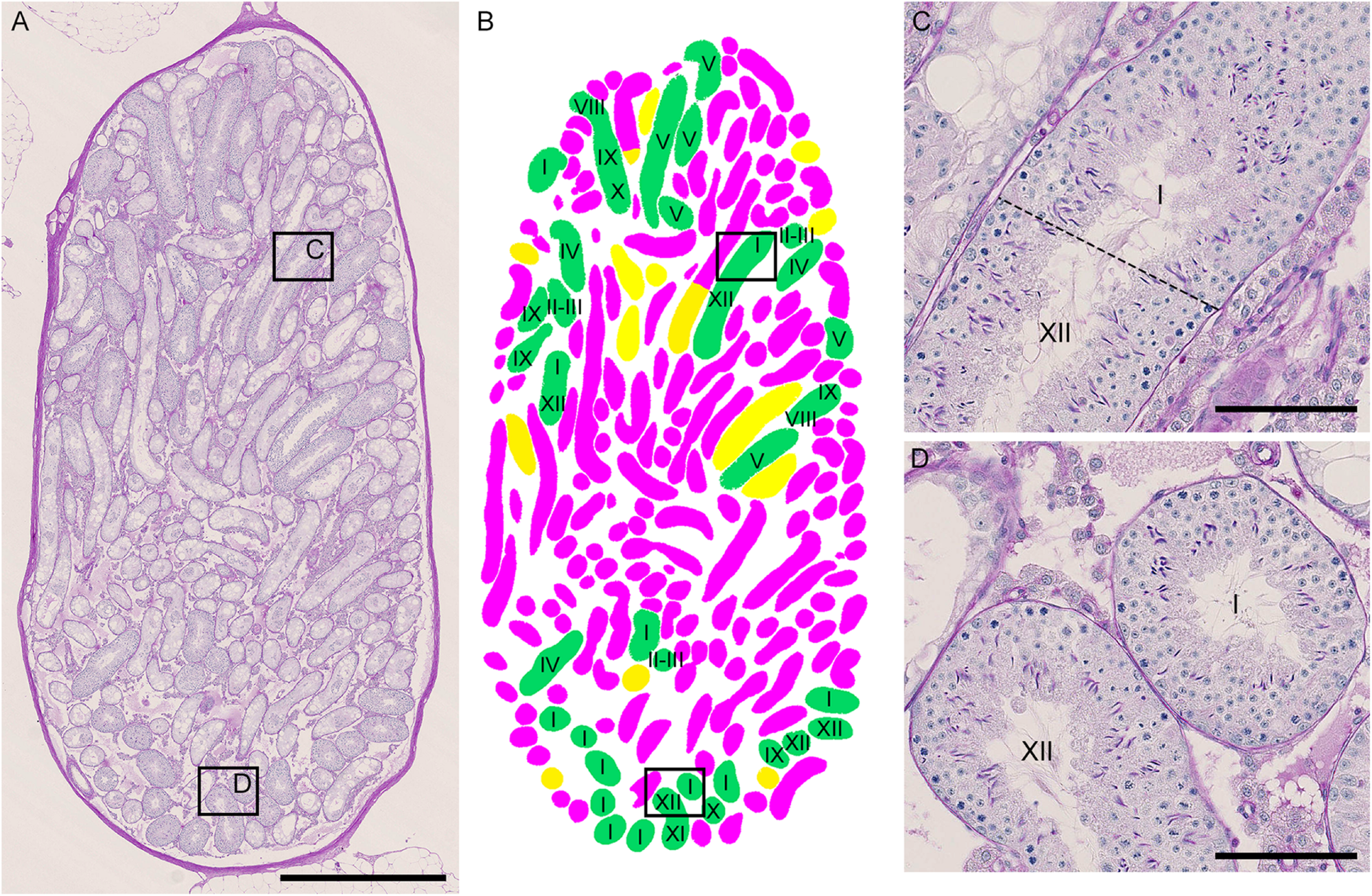 Photographs of a representative cross-section of IP-30 testis from #10 mouse shown with PAS-H staining (A) and with assessment of the degree of spermatogenesis disorder and identification of stages in individual tubule sections (B). The framed areas in (A) are shown at a high magnification (C,D). The colors in (B) represent normal tubules (green), abnormal tubules with spermatocytes (yellow), and abnormal tubules without spermatocytes (red). The roman numerals in (B–D) represent stages I–XII. Scales, 1 mm (A), 100 μm (C,D).