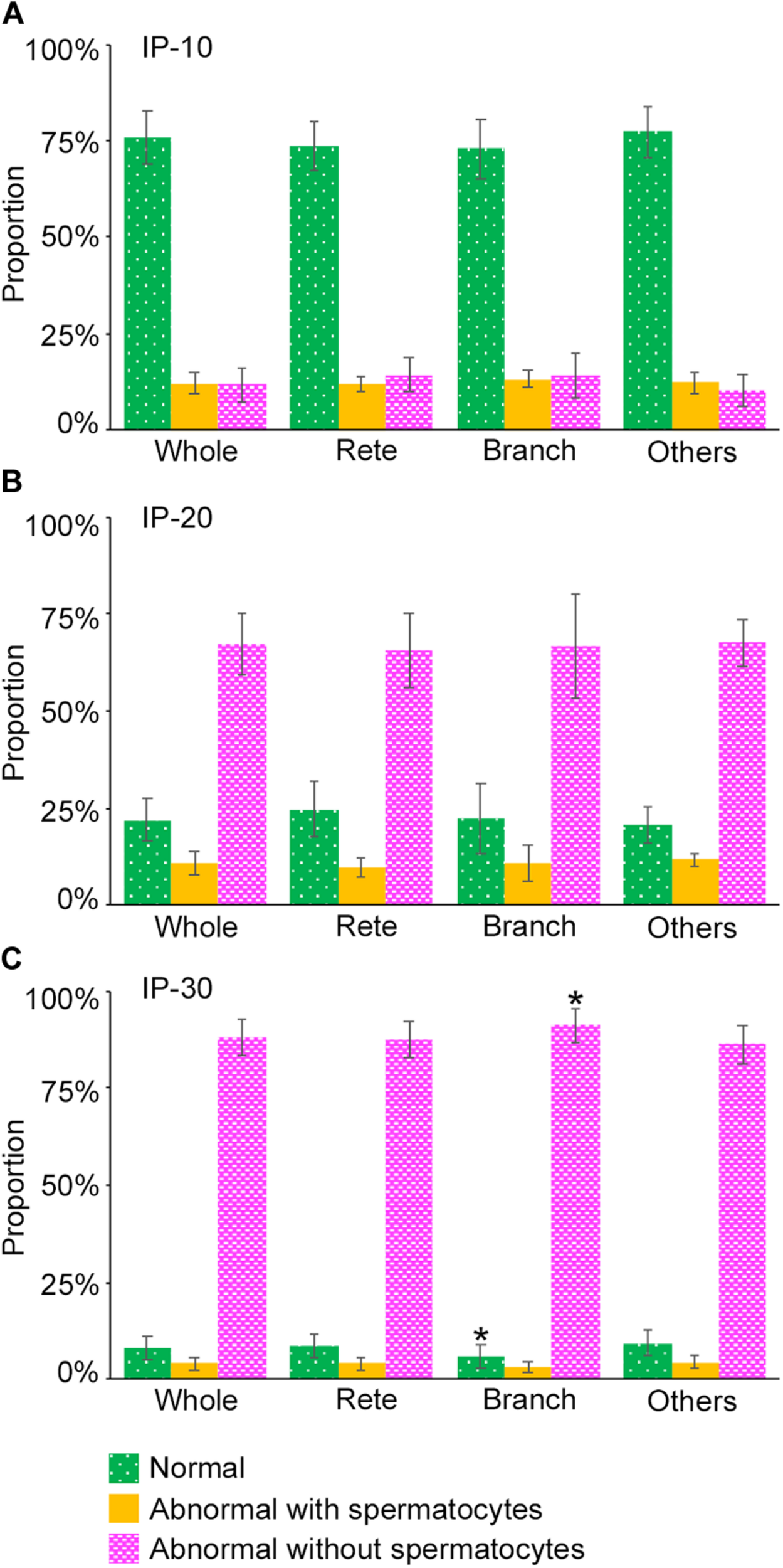 Proportions of different degrees of spermatogenesis disorder at different 3D positions in the seminiferous tubules in mice treated with different busulfan doses, IP-10 (A), −20 (B), and −30 (C). The colors represent normal tubules (green), abnormal tubules with spermatocytes (yellow), and abnormal tubules without spermatocytes (red). The abbreviations of the positions in seminiferous tubules are as follows: whole for all tubule areas, Rete for areas within 10 mm from the terminating points, Branch for areas within 10 mm from the branching points, and Others for areas more than 10 mm apart from the terminating points and branching points. Each value represents the mean ± SD of three samples. Statistical analysis was performed between the values of Whole and those of Rete, Branch, or Others for the same colors. *Significantly different from Whole (P < 0.05).