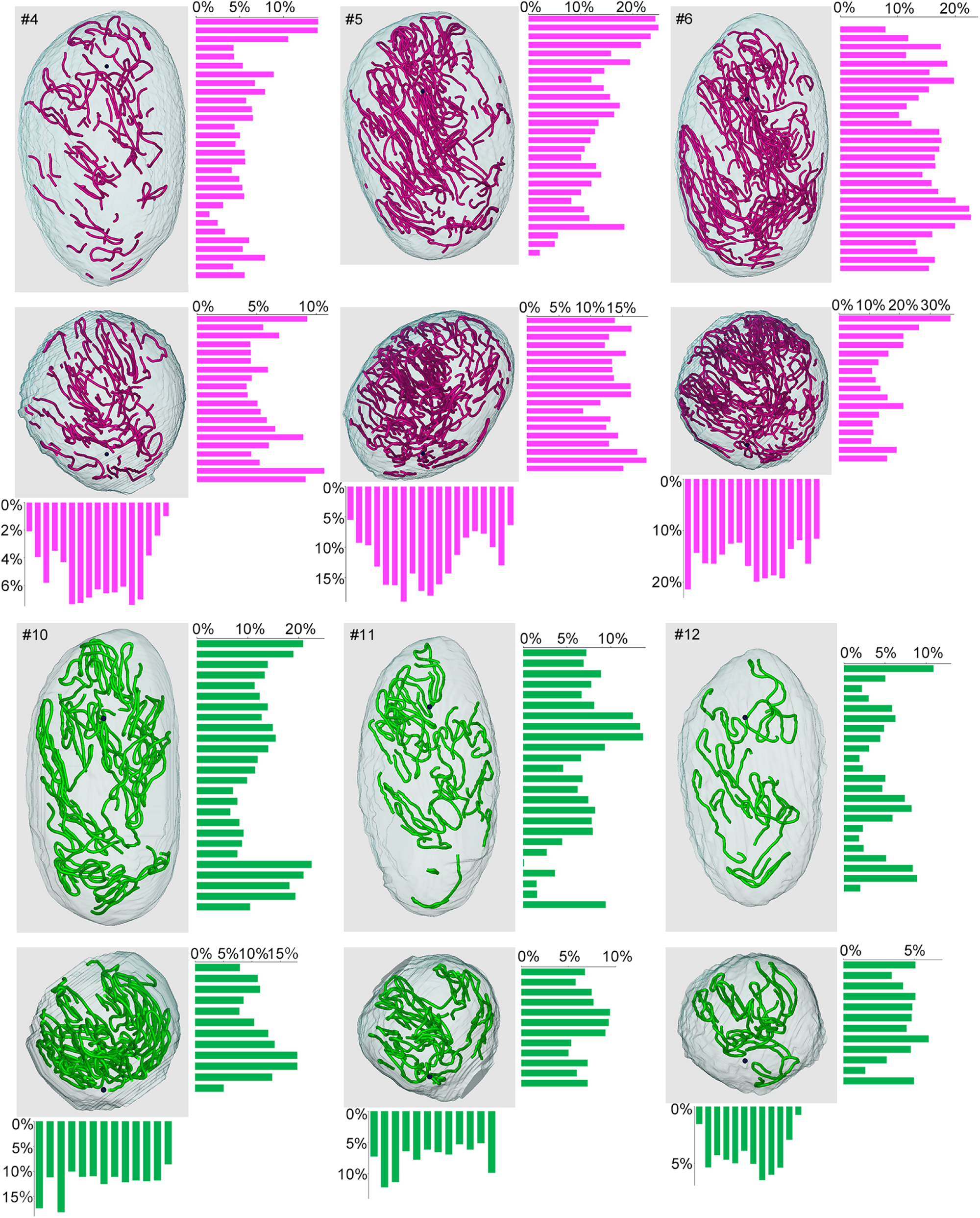 Proportions of different degrees of spermatogenesis disorder at different 3D positions in the testes from mice treated with different busulfan doses. The relative lengths of abnormal segments without spermatocytes (red) in IP-10 (#4, 5, 6) and those of normal segments (green) in IP-30 (#10, 11, 12) were measured in all tubule areas involved in 200-μm-thick serial slices of each testis parallel to the three planes formed by the X, Y, and Z-axes. The 3D core lines of all red or green segments in each testis, and the bars representing the proportions (%) of segments with respective colors in each slice are shown.