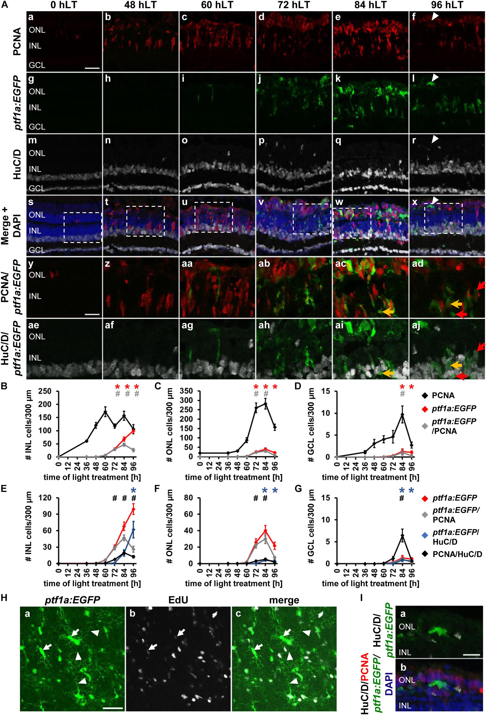 Figure 4. Amacrine and horizontal cell competence factor ptf1a is upregulated in the light-damaged retina. (Aa–aj) Single z-plane confocal images of retinal sections from light-damaged Tg[ptf1a:EGFP]jh1 zebrafish (0, 48, 60, 72, 84, 96 hLT) immunolabeled for PCNA (Aa–f,As–ad), GFP (Ag–l,As–aj), HuC/D (Am–x,Aae–aj) and counterstained with DAPI (As–x). (Ay–aj) Regions outlined in panels (As–x) at higher magnification. Arrowhead, ptf1a:EGFP-positive ONL cell with an elongated morphology. Yellow arrows, ptf1a:EGFP, PCNA and HuC/D-triple positive cell. Red arrows, ptf1a:EGFP and HuC/D-double positive cell that is PCNA-negative. (B–D) Number of PCNA-positive, ptf1a:EGFP-positive and PCNA and ptf1a:EGFP-double positive cells in the INL (B), ONL (C), and GCL (D) over the light treatment timecourse. (E–G) Number of ptf1a:EGFP-positive, ptf1a:EGFP and PCNA−double positive cells in comparison to ptf1a:EGFP and HuC/D-double positive and PCNA and HuC/D-double positive cells in the INL (E), ONL (F), and GCL (G) of retinas exposed to constant intense light for 0, 36, 48, 60, 72, 84 and 96 h. Mean ± SE, n ≥ 10, *pTukey < 0.05 and #p < 0.05 indicate comparisons to 0 hLT for the different measures that were assessed. The symbols are color-coded according to the line that they represent in the corresponding graphs (pANOVA, see Table 1). Note, significance was not determined for PCNA in panels (B–D) and symbols indicating significance for ptf1a:EGFP and ptf1a:EGFP and PCNA-double-positive cells are not shown in panels (E-G), as they are indicated in panels (B–D). (Ha–c) Maximum projections of five confocal z-sections at the level of the inner plexiform/amacrine cell layer in light-damaged Tg[ptf1a:EGFP]jh1 dorsal retinal flatmounts at 96 hLT. Newly generated ptf1a:EGFP-positive amacrine cells (Ha,c) identified by EdU [(Hb,c); arrows], which was intraperitoneally injected during the proliferative phase, display neurite outgrowth (arrowheads). The images are representative of three independent experiments. (I) Higher magnification confocal images of the horizontally elongated ptf1a:EGFP-positive ONL cell at 96 hLT in panel (Al) (arrowhead), which potentially represents a newly generated horizontal cell. Confocal images also display HuC/D (Ia,b), PCNA (Ib) and DAPI (Ib). Scale bars, 20 μm (Aa, Ha) and 10 μm (Ay, Ia).