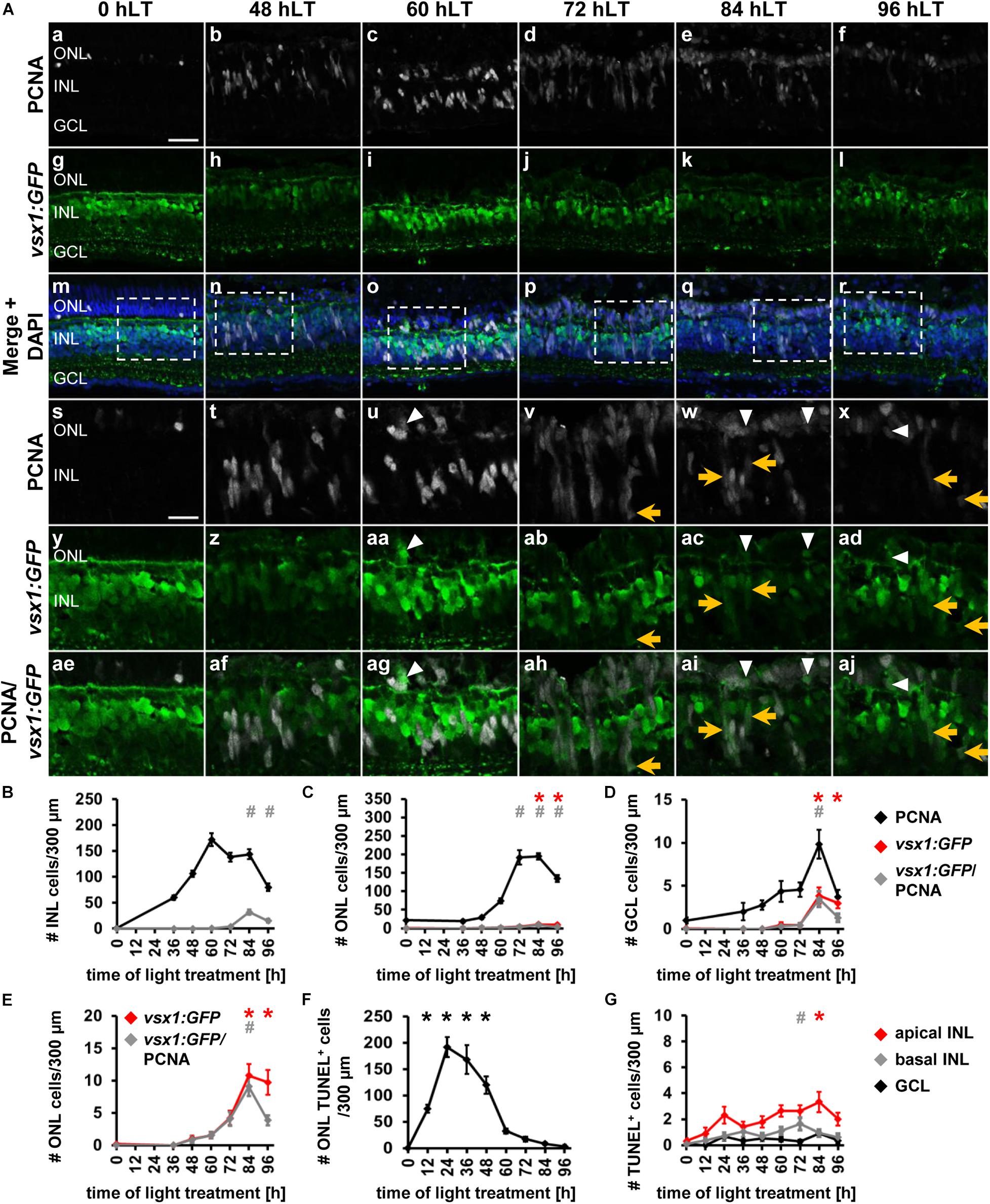 Figure 6. Bipolar cell competence factor vsx1:GFP is expressed in proliferating cells in the light-damaged retina. (Aa–aj) Single z-plane confocal images of retinal sections from light-damaged TgBAC[vsx1:GFP]nns5 zebrafish (0, 48, 60, 72, 84, 96 hLT) immunolabeled for PCNA (Aa–f,Am–x,Aae–aj), GFP (Ag–r,Ay–aj) and counterstained with DAPI (Am–r). (As–aj) Regions outlined in panels (Am–r) at higher magnification. Scale bars, 20 μm (Aa) and 10 μm (As). (B–D) Number of PCNA-positive, vsx1:GFP-positive and PCNA and vsx1:GFP-double positive cells in the INL (B), ONL (C), and GCL (D) over the light treatment timecourse. (E) Number of vsx1:GFP-positive and vsx1:GFP and PCNA−double positive cells in the ONL at a different scale. (F,G) Number of TUNEL-positive cells in the ONL (F) and in the inner retina (G), (apical INL, basal INL, GCL) following constant intense light treatment for 0, 12, 24, 36, 48, 60, 72, 84 and 96 h. Mean ± SE, n ≥ 10. *pTukey < 0.05 and #p < 0.05 indicate comparisons to 0 hLT for the different measures that were assessed. The symbols are color-coded according to the line that they represent in the corresponding graphs (pANOVA, see Table 1). Note, significance was not determined for PCNA in panels (B–D).