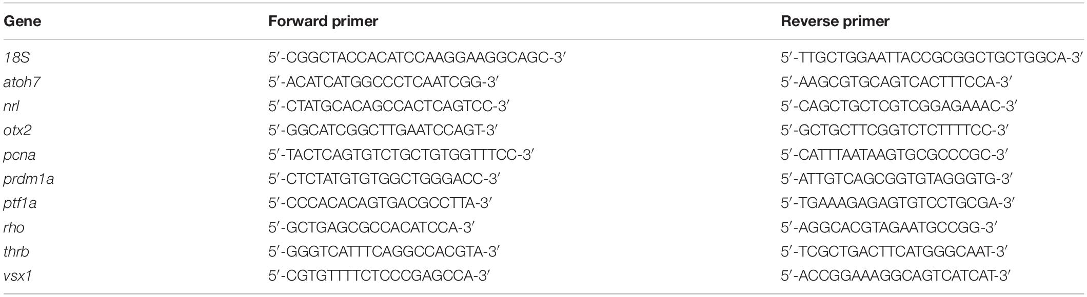 Dorsal or whole retinas were isolated from light-damaged albino zebrafish (0, 36, 48, 60, 72, 84, 96 hLT and 2, 5, and 7 drec) or metronidazole-treated albino;Tg[rho:Eco.NfsB-EGFP]nt19 zebrafish (0, 24, 48, 72, 96, and 120 h after metronidazole treatment onset), respectively. Retinas were homogenized in TRIzol following the manufacturer’s instructions to the step of phase separation, when the clear phase was mixed with 75% ethanol before transferring the mixture onto a RNeasy column (Qiagen) The RNeasy kit protocol was followed starting at the step of the RNeasy column and included a 15 min DNase step (Qiagen) according to manufacturer’s instructions. The resultant RNA was stored at −80°C. cDNA was prepared using qScript cDNA super mix (QuantaBio) and subjected to quantitative real-time polymerase chain reaction (qRT-PCR) as previously described (Gorsuch et al., 2017) using primers listed in Table 2.