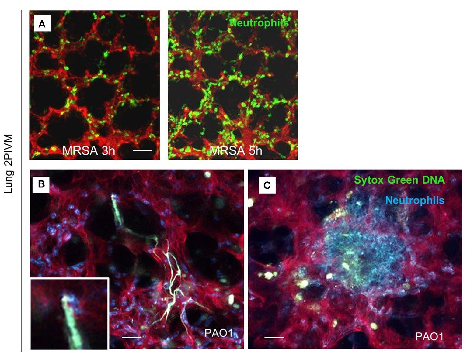 Lefrançais et al. utilized multiphoton microscopy for visualization of neutrophil recruitment and NET formation in experimental MRSA-induced pneumonia (Lefrançais et al., 2018). The left lung of the mice was exposed surgically and stabilized via a flanged thoracic window with a coverslip and vacuum suction. Infection with MRSA rapidly induced neutrophil recruitment and sequestration in the lung beginning 2 h post infection. In addition, after PAO1 challenge, neutrophil swarming and formation of neutrophils clusters around the bacteria were observed (Figure 1).