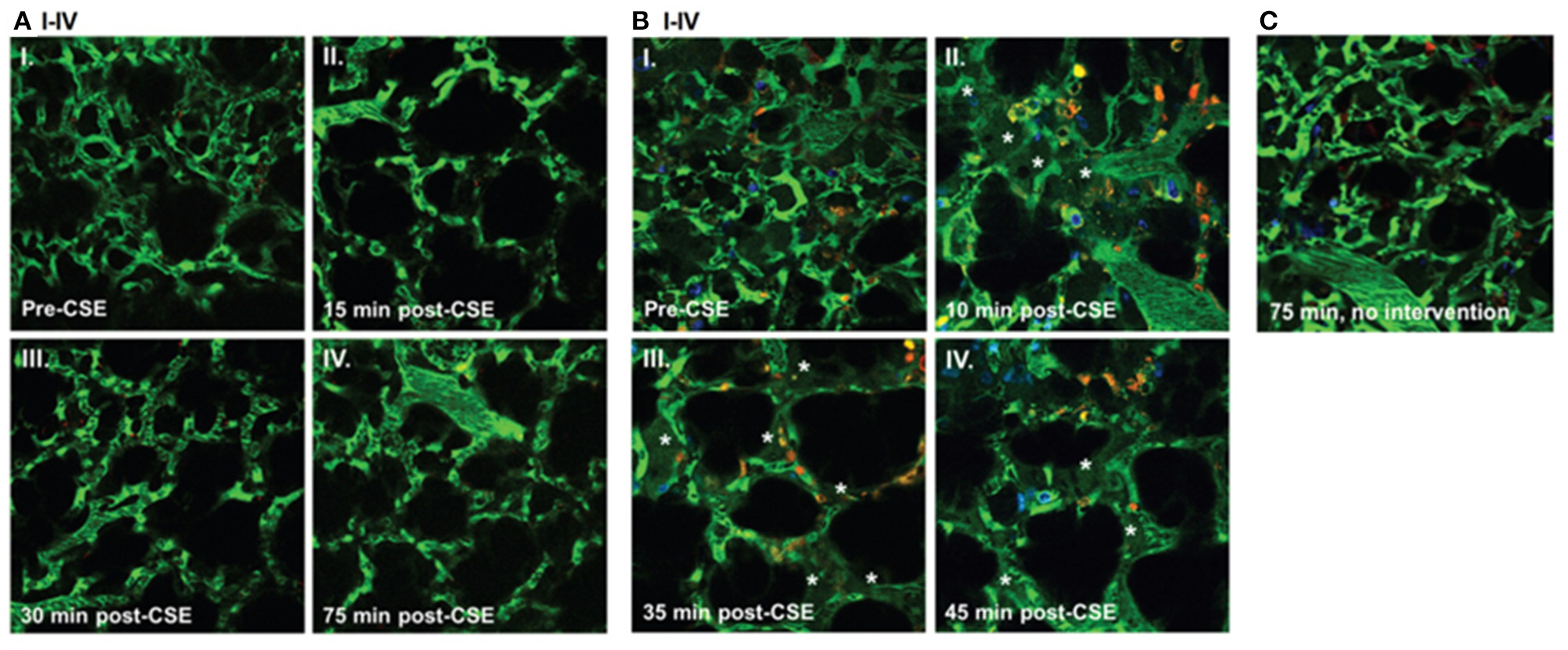 Effect of cigarette smoke extract (CSE) on the lung microcirculation captured in real time in the pulmonary microvasculature of a living wild-type (WT) (A); and cystic fibrosis transmembrane conductance regulator (CFTR)–deficient (B) mouse. Three-dimensional reconstruction of fluorescein isothiocyanate– labeled vessels (green) surrounding alveoli (dark regions) and Rho-G6-labeled neutrophils (orange) imaged via intravital 2-photon microscopy before (AI and BI) and after (A and BII–IV) intravenous administration of CSE (100 μL of 20% CSE). Nuclei were stained with intravenous Hoechst (blue). Note increasing neutrophil trafficking and plasma extravasation (asterisks) into airspaces after CSE administration in the CFTR-deficient (B) but not WT (A) mouse and compared to a CFTR-deficient mouse not receiving CSE (C) (Brown et al., 2014).