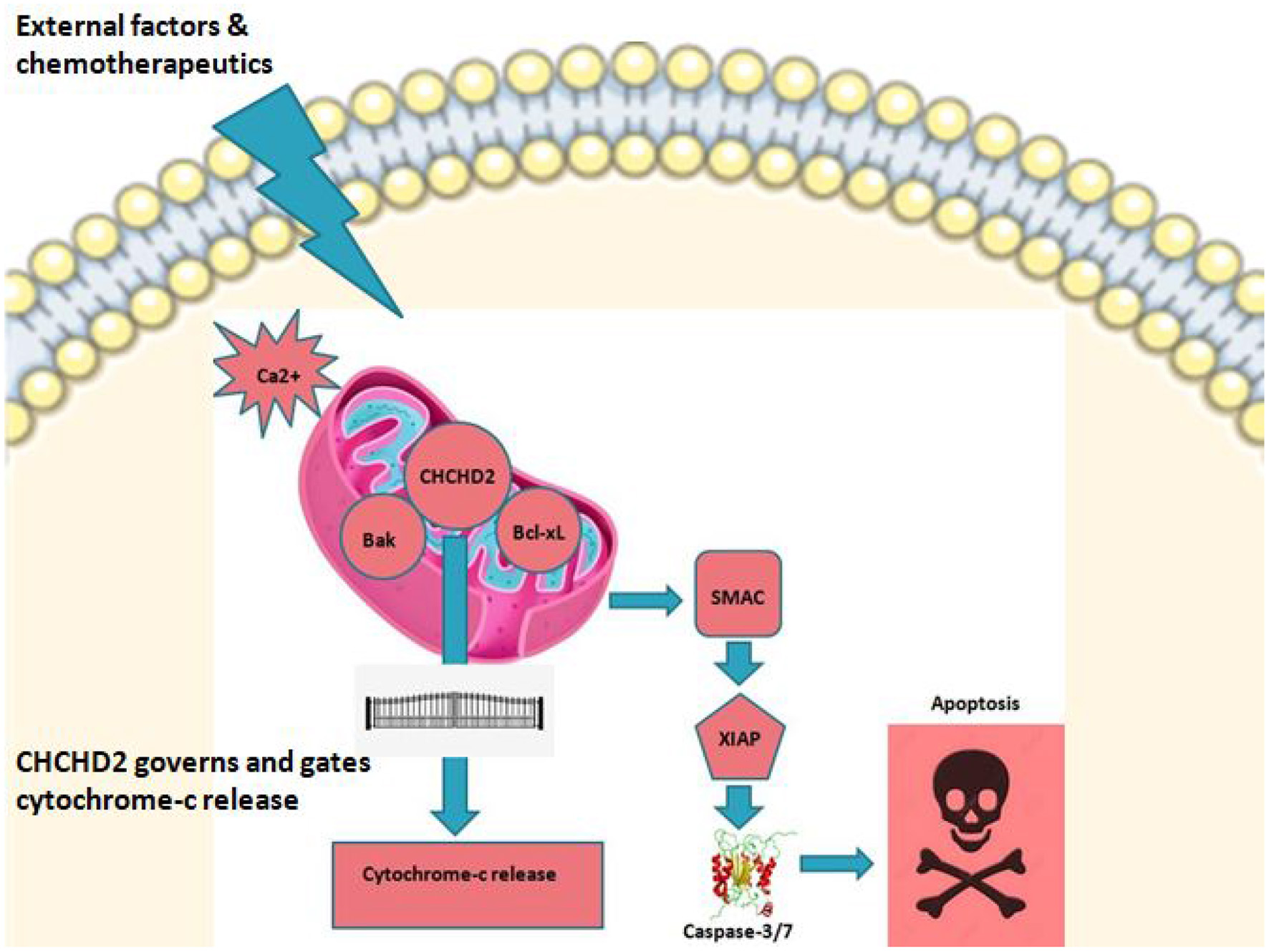 CHCHD2 and role play. CHCHD2 in mitochondria under stress or under external stimulus controls apoptosis in cancer. Among the numerous proteins and protein complexes that control apoptotic pathways, IAP (inhibition of apoptosis) proteins play an important role. There are two predominant ways by which IAP proteins regulate apoptosis. c-IAP proteins do not bind caspases at a physiologically meaningful level. Instead, they regulate caspase activation indirectly through their E3 ligase activity and modulation of TNF-mediated cell death as well as Toll signaling, innate immunity and NF-κB pathways. Anti-apoptotic activity of XIAP stems primarily from its direct binding to and inhibition of caspase-3,−7, and−9. On the other hand, IAP's are negatively regulated by IAP-antagonists like second mitochondrial derived activator of caspases (SMAC). Upon triggering of intrinsic pathway, SMAC is released into cytosol where caspase activation is initiated leading to programmed cell death. It is believed that CHCHD2 drives this principal cell fate interplay thereby acting as a vital switch in regulating mitochondrial mediated apoptosis.