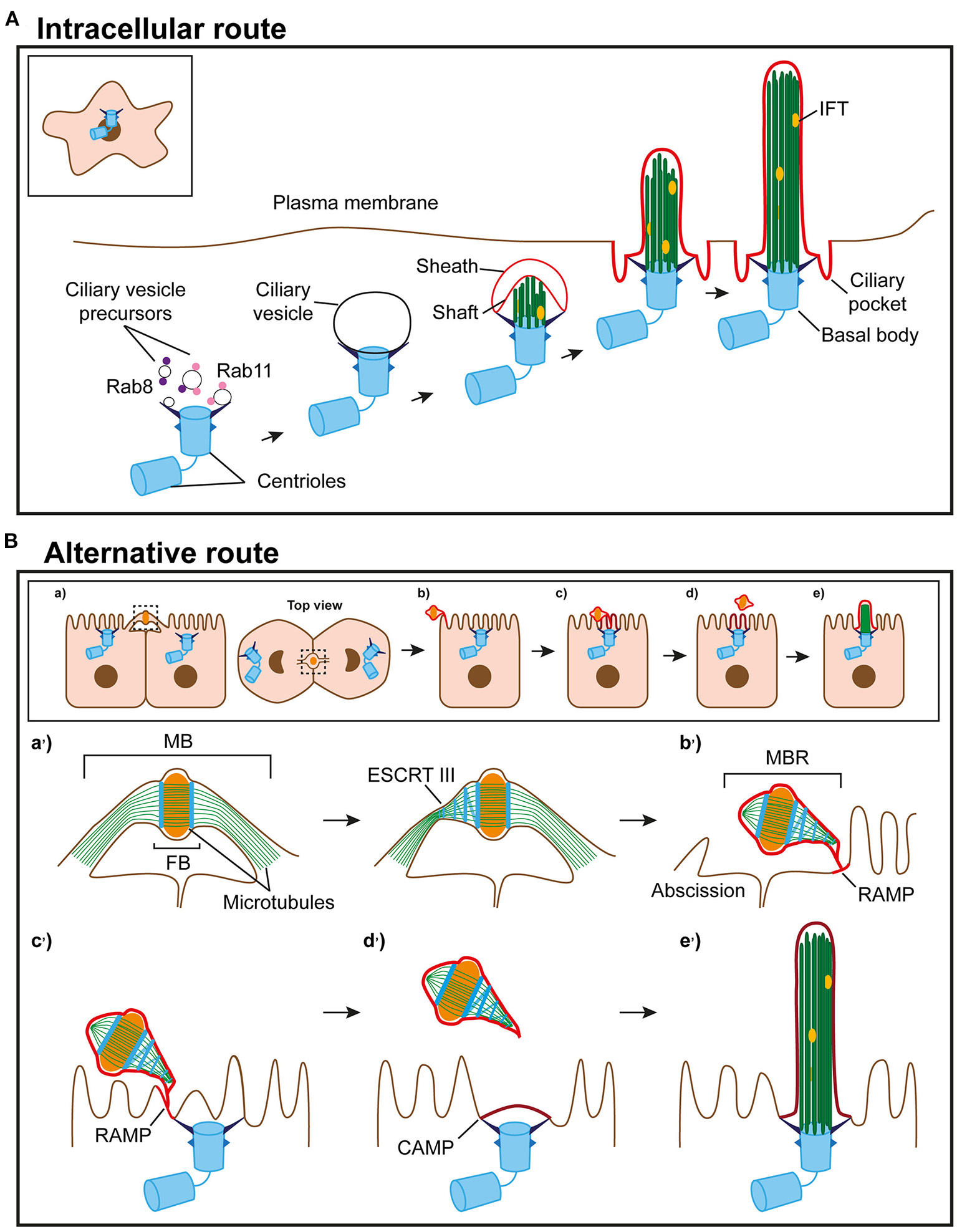 Routes of primary ciliogenesis. (A) The intracellular route. Ciliogenesis begins with the formation of a large ciliary vesicle at the distal end of the appendages of the mother centriole by fusion of smaller vesicles. The axoneme starts forming intracellularly and, as it grows, deforms the ciliary vesicle and establishes an inner membrane (shaft) and an outer membrane (sheath). The incipient cilium is finally exocytosed and the cilium becomes exposed in the plasma membrane. The sheath gives rise to the ciliary pocket, and the shaft forms the ciliary membrane. (B) Model of the alternative route. (a) In polarized epithelial cells, the intercellular bridge containing ciliary proteins forms at the apical cell surface during cytokinesis. (b) When abscission occurs, the MBR is inherited by one of the daughter cells, acquires a RAMP and localizes at the periphery of the apical surface. (c) The MBR/RAMP moves over the apical surface toward the centrosome, which is docked at the center of the apical membrane. (d) When the MBR is proximal to the centrosome, the RAMP splits into two patches, one of which remains at the MBR and the other, known as the CAMP, occupies the centrosome zone. (e) The ciliary membrane stems from the CAMP. The entire process of primary cilium formation takes place in the plasma membrane. The events occurring at the apical surface in (a–e) are shown in more detail in the corresponding enlargements in (a'-e').