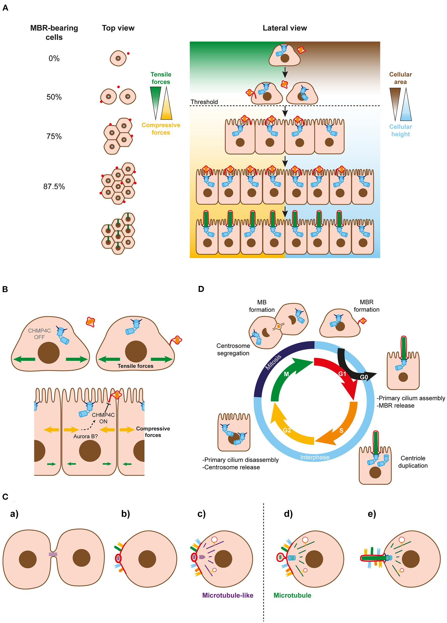 Regulation of MBR inheritance at the cell-population and single-cell levels. (A) Simplified model of MBR retention at the cell-population level. When the area of the cells falls below a threshold (discontinuous line), cells continue dividing and generating new midbody remnants that move to the cell center and enable ciliogenesis. Successive cycles of cell division increase the number of MBR-bearing cells exponentially. The remaining fraction of cells without an MBR could be kept to generate a small pool of non-ciliated cells or be extruded from the cell monolayer. (B) Role of CHPM4C in MBR retention. A membranous stalk physically connects the MBR membrane and the plasma membranes of most MBR-containing cells. The stalk is derived from the uncleaved arm of the bridge and contains ESCRT machinery, including the regulatory subunit CHMP4C. CHMP4C acts on the second cut of the bridge membrane to preserve the MBR membrane connected to the plasma membrane. The integrity of the connection is necessary at the single-cell level to enable the centrosome to form a primary cilium. The change from tensile to compressive forces might act on CHMP4C in some way to prevent the cleavage of the second MB arm, allowing the connected MBRs to be inherited. (C) Schematics of the proposed evolutionary process leading to cilium emergence. (a) The intercellular bridge acquired microtubule-like filaments during prokaryotic-to-eukaryotic cell evolution. A primitive remnant containing this type of filament originated after the daughter cells separate. (b) The membrane of the remnant progressively acquired receptors and specialized lipids and formed a sensory patch. (c) A primordial microtubule-like organizing center emerged near the patch to nucleate microtubule-like filaments that, with the emergence of molecular motors, served as tracks for vectorial transport to the patch. (d) Microtubules replaced the microtubule-like filaments. The MTOC and the bridge remnant co-evolved in a basal body and an MBR, respectively. (e) The basal body acted as template for the formation of the axoneme, and the patch became the ciliary membrane. Since it was no longer necessary for it to remain at the plasma membrane, the MBR was discarded after the cilium had been assembled. At the beginning of the evolutionary process, both daughter cells probably inherited part of the bridge as a remnant. The acquisition of ESCRT machinery later on during evolution enabled MBR inheritance regulation. The discontinuous line indicates the transition between microtubule-like filaments and microtubules. (D) The three microtubule-based organelles and the cell cycle. The centrosome functions as a basal body in the cilium when cells are in the G0 phase, and is repurposed as the major MTOC when the cilium is disassembled and the cell returns to the cell cycle. It distributes to the poles of the mitotic spindle during the M phase. Once mitosis ends, with the formation of two identical nuclei, the MB forms to divide the cytoplasm into two halves, and gives rise to the MBR when the process of abscission is completed. Cells enter the G1 phase with the centrosome and the MBR in readiness to become engaged in primary cilium assembly.