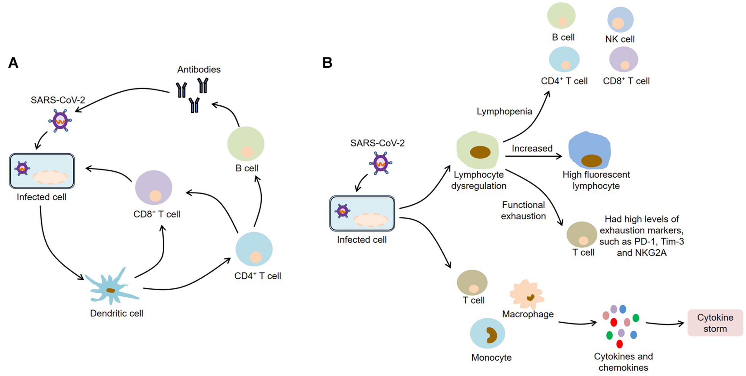 Immunopathology of COVID-19. (A) SARS-CoV-2 infection activates humoral and cellular immunity mediated by virus-specific B and T cells; (B) SARS-CoV-2 infection causes lymphocyte dysregulation and cytokine storm, which contribute to the development of COVID-19. SARS-CoV-2, severe acute respiratory syndrome coronavirus 2; COVID-19, coronavirus disease 2019; NK, natural killer; PD-1, programmed death-1; Tim-3, T-cell immunoglobulin and mucin-domain containing-3; NKG2A, CD94/NK group 2 member A.