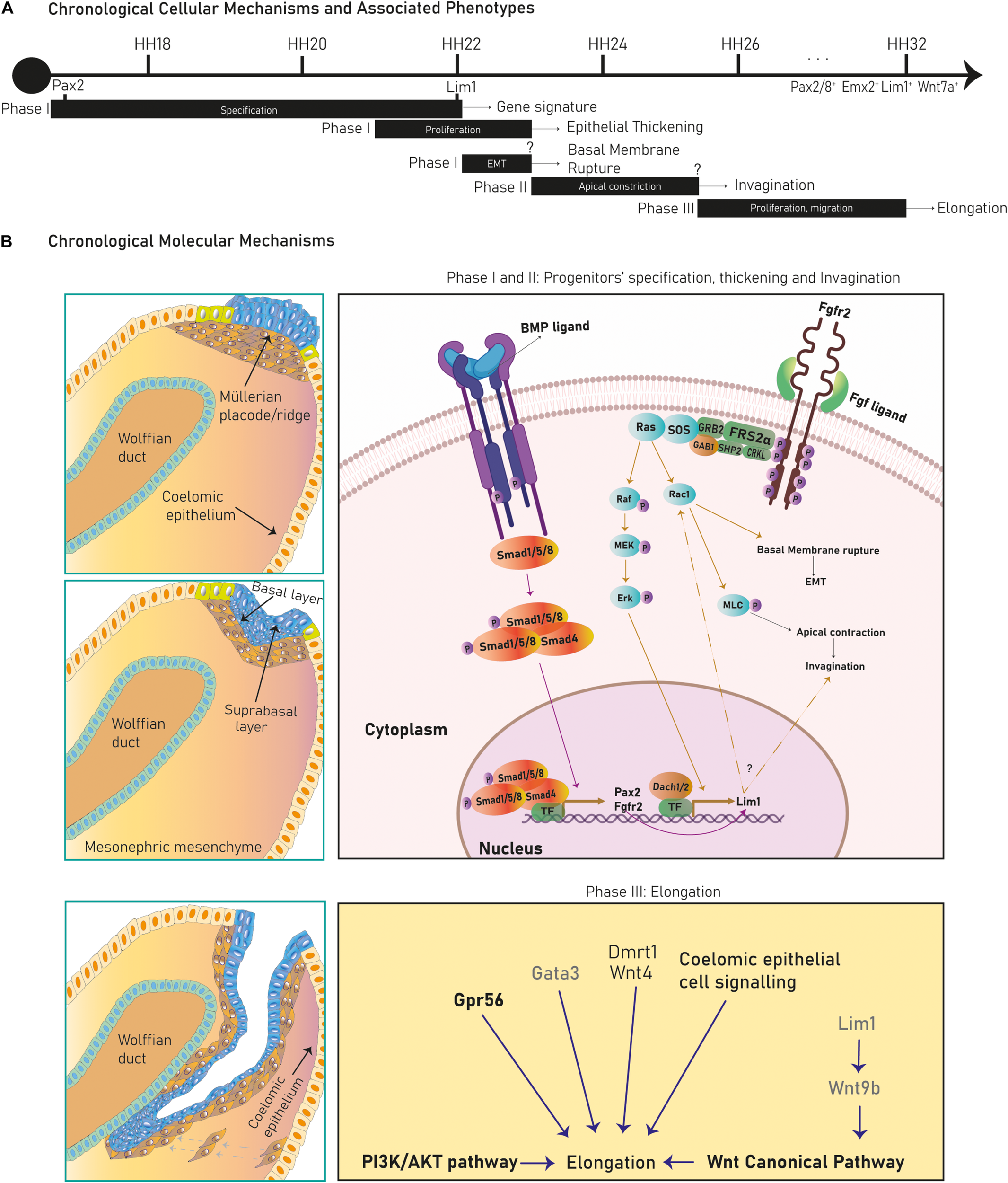 Cellular mechanisms and molecular pathways in Müllerian duct development. Several cellular mechanisms chronologically succeed during chicken Müllerian duct development (A). In (B), early stages in Müllerian duct development are governed by the BMP pathway regulating Pax2, activating the FGF/RAS/ERK pathway and promoting Lim1 expression and apical constriction control. Dach1/2 and Pax2 also regulate Lim1. Later, development proceeds through rostral-caudal elongation depending on Wolffian paracrine signals, such as Lim1-regulated Wnt9b, which activates the Wnt Canonical pathway. Besides, the PI3k/Akt pathway, coelomic epithelium signaling and Wnt4, Gata3, Gpr56, and Dmrt1 regulate elongation. Genes/pathways in bold are expressed/intrinsic to Müllerian epithelial cells, genes in light are expressed by mesonephric mesenchymal cells and genes in gray are expressed by Wolffian epithelial cells.