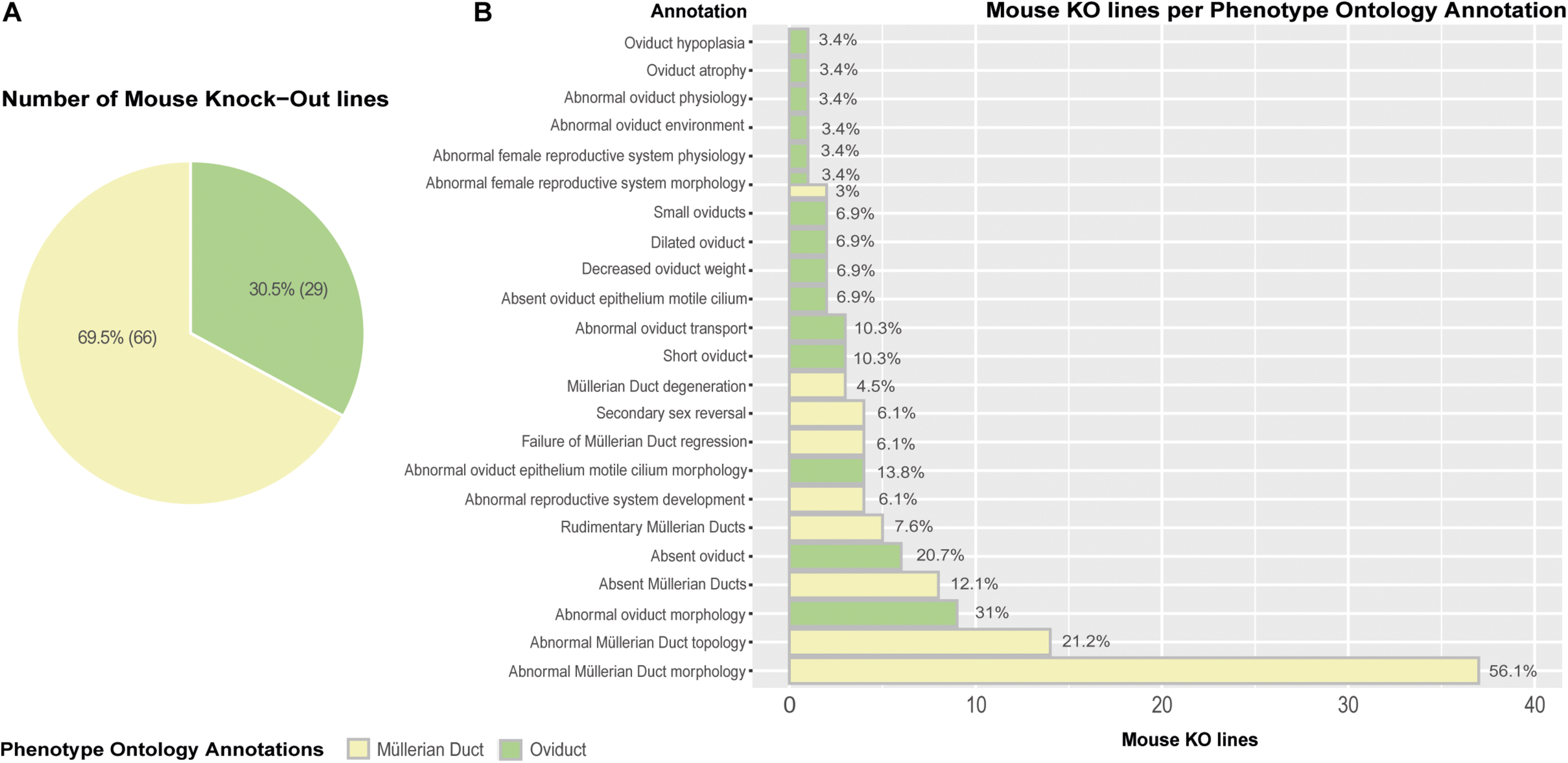 Mouse knock-out (KO) lines expressing Phenotype Ontology Annotations (POA) associated to Müllerian ducts/oviducts. (A) Pie chart representing KO lines in the MGI database registering at least one POA related to Müllerian duct/oviduct. (B) Barplot depicting the number of KO lines per annotation. Percentages are calculated as the number of mouse KO lines displaying a Phenotype Ontology Annotation out of the total number of mouse KO lines per POA type.