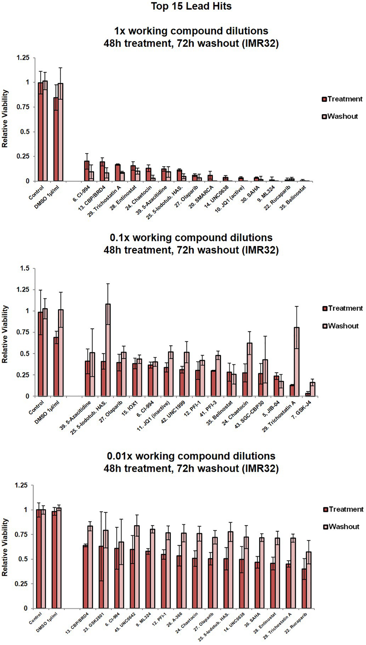 Cell viability assessment for IMR32 cells upon treatment with the top 15 lead SGC library compounds. Compound dilutions are indicated above histograms (1x, 0.1x or 0.01x). Treatment bars – viability upon 48h treatment. Washout bars – viability 72 h upon washout, relative to corresponding untreated control at the same time point. For results from all 45 compounds in the library please see Supplementary Figure 1C. Error bars indicate the mean ± SD.